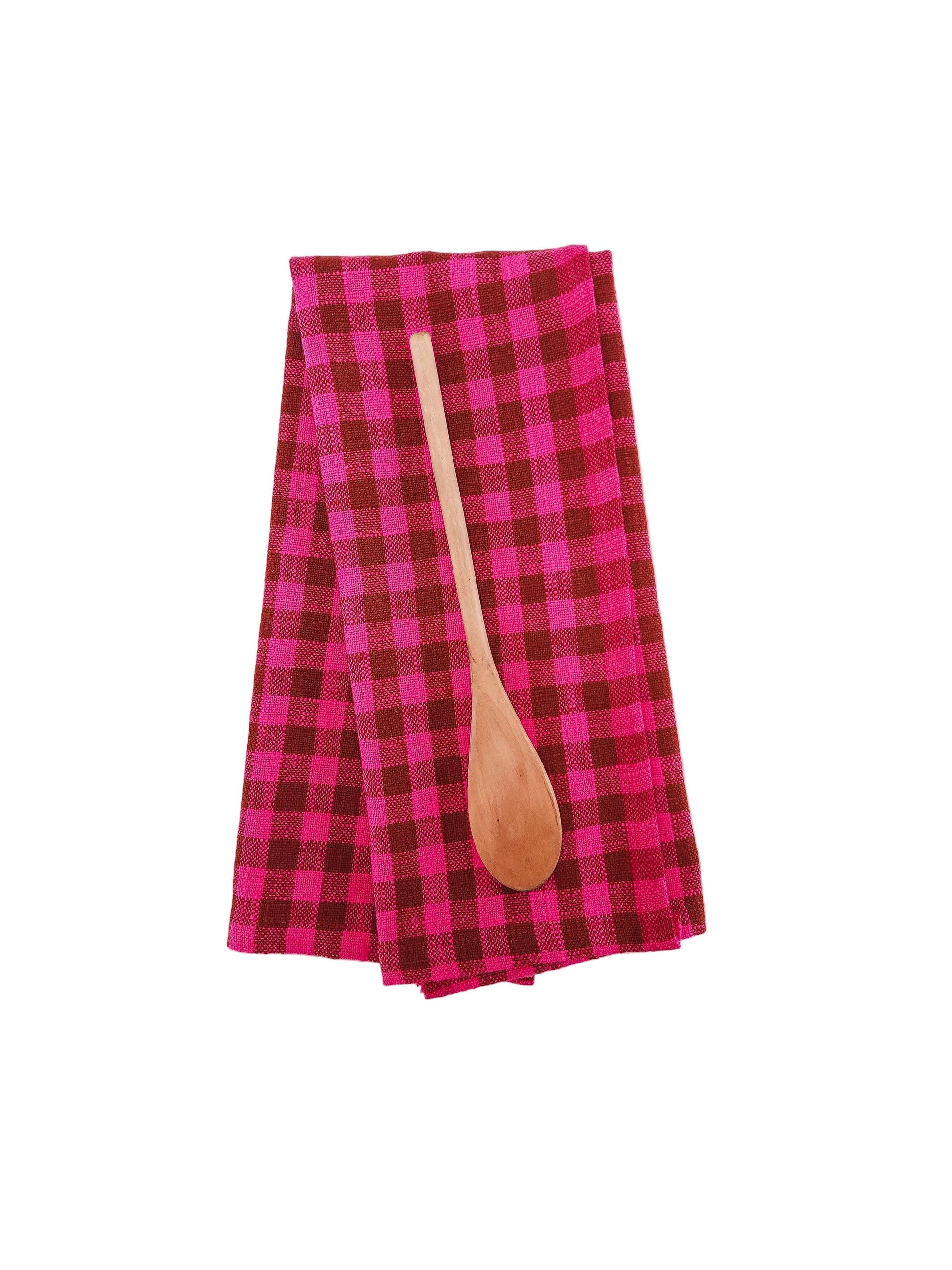 This kitchen towel adds fun color to your kitchen. The towel is 100% cotton, with a woven checkered pattern in brown and vibrant pink. It has a cotton loop for hanging on your favorite hook.