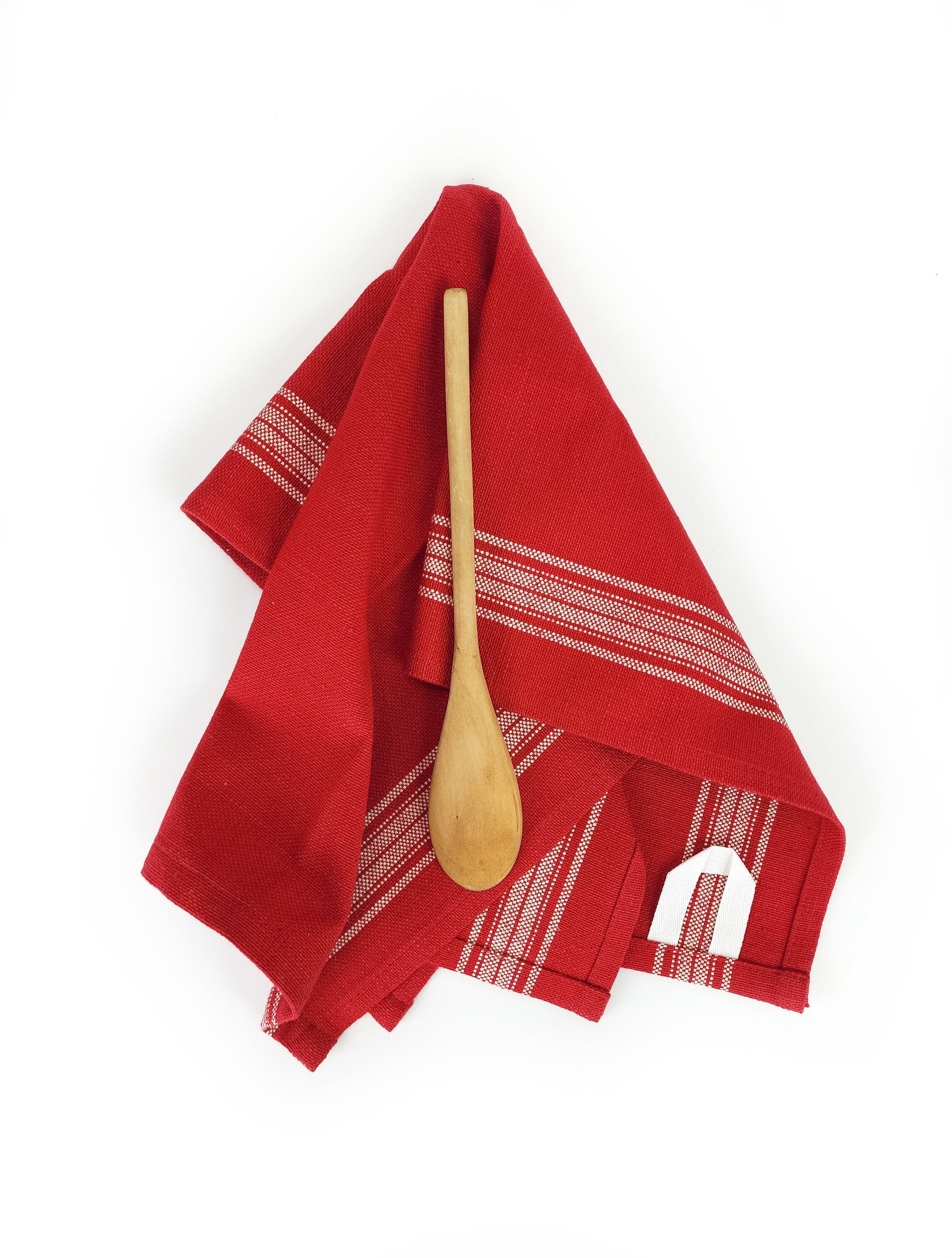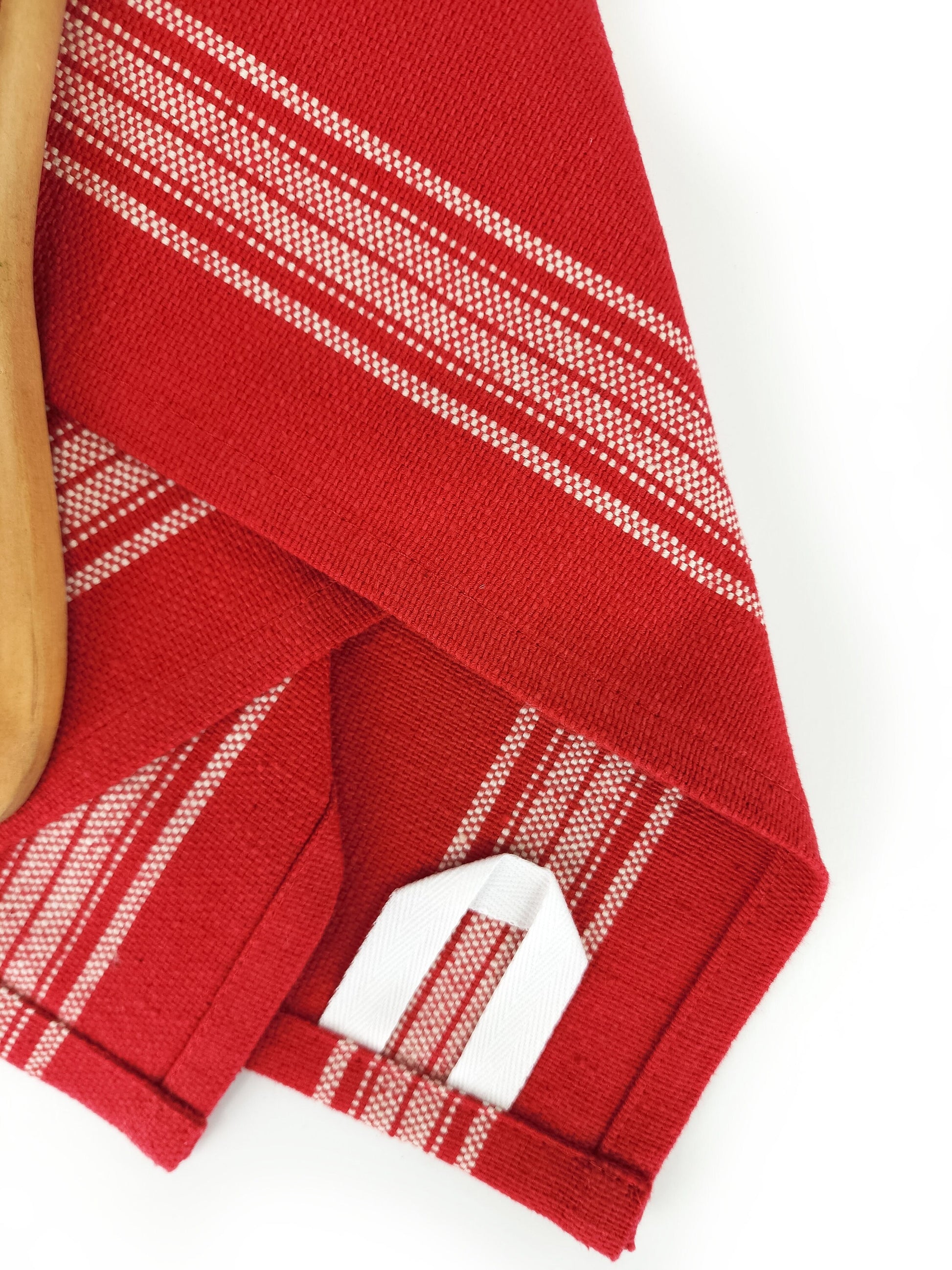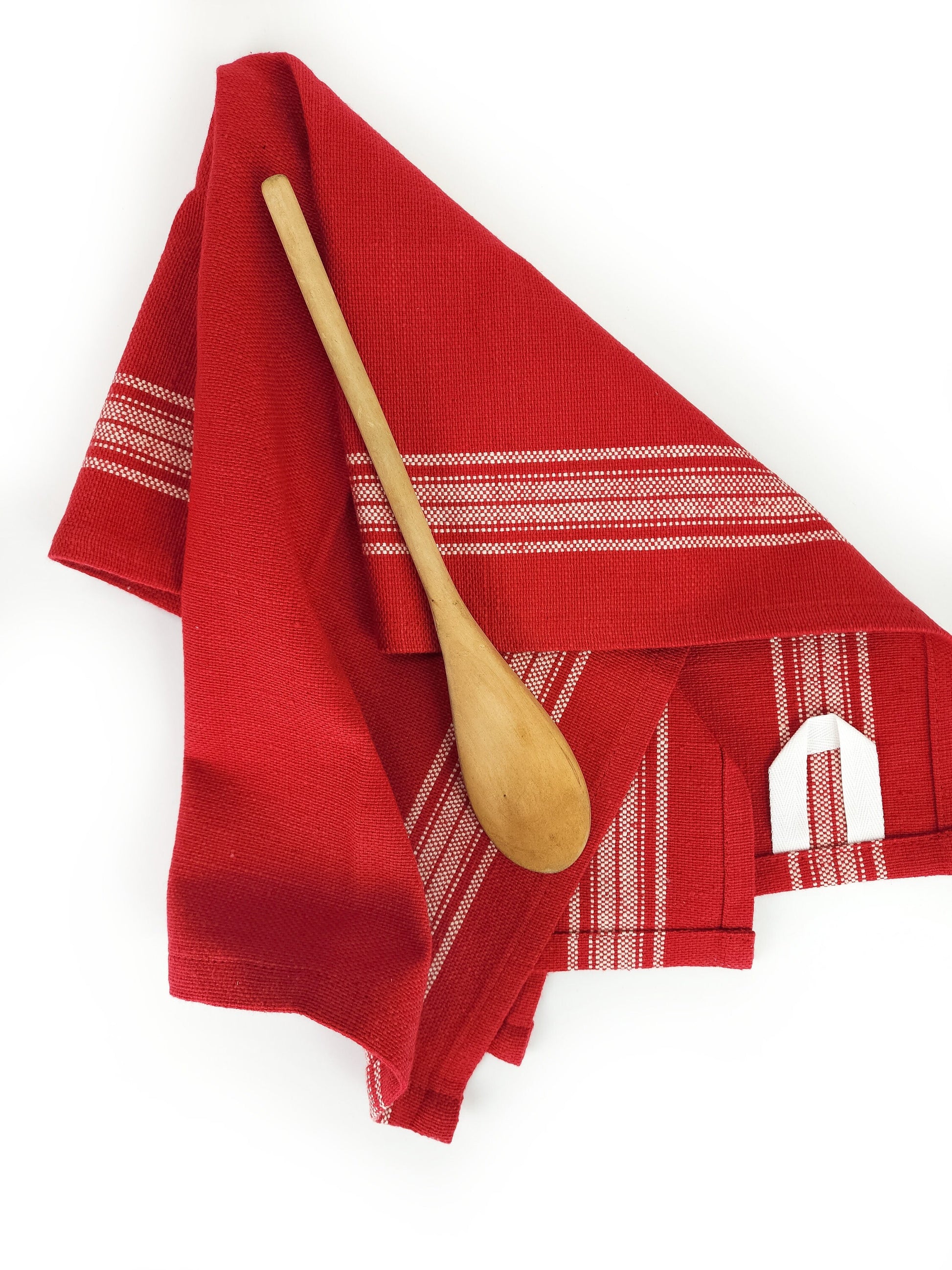 This red grain sack inspired kitchen tea towel is a perfect way to add a splash of red to your kitchen decor and makes a great gift. It is made of thick red cotton with a cream stripe on each edge.