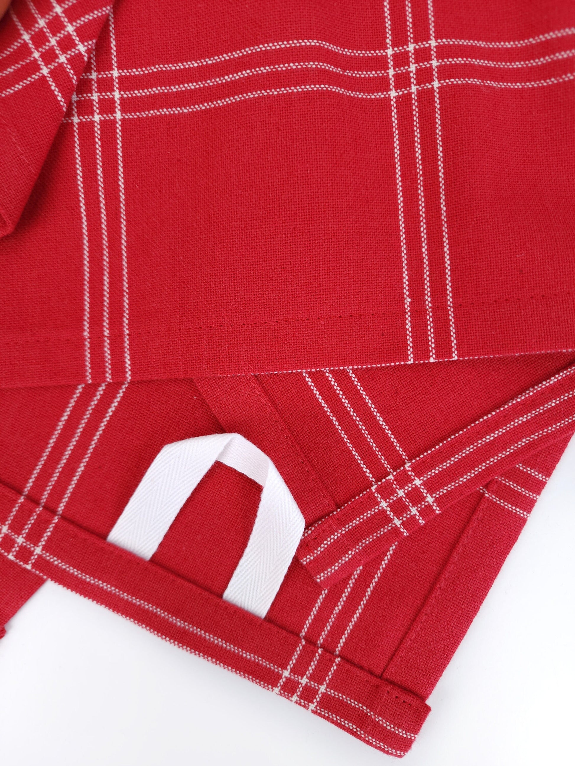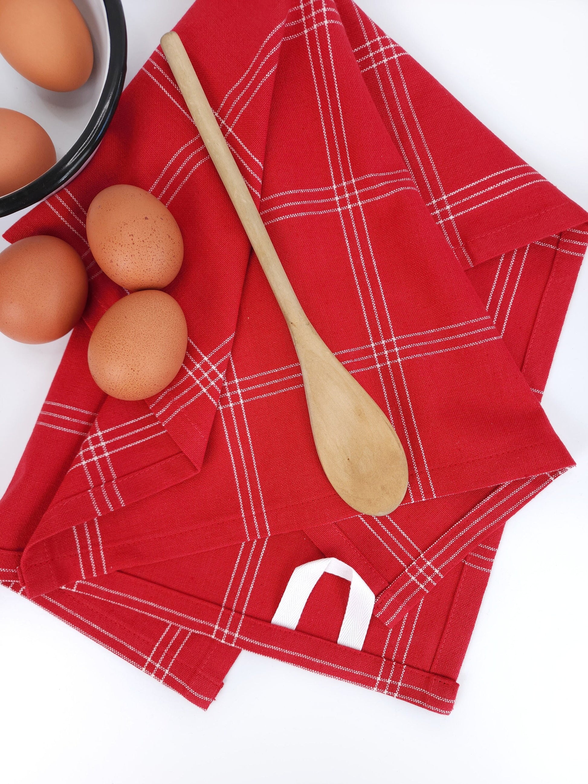 This red plaid kitchen towel is a perfect way to add color to your kitchen decor. The towel is made of lightweight red cotton with a woven cream, plaid pattern.