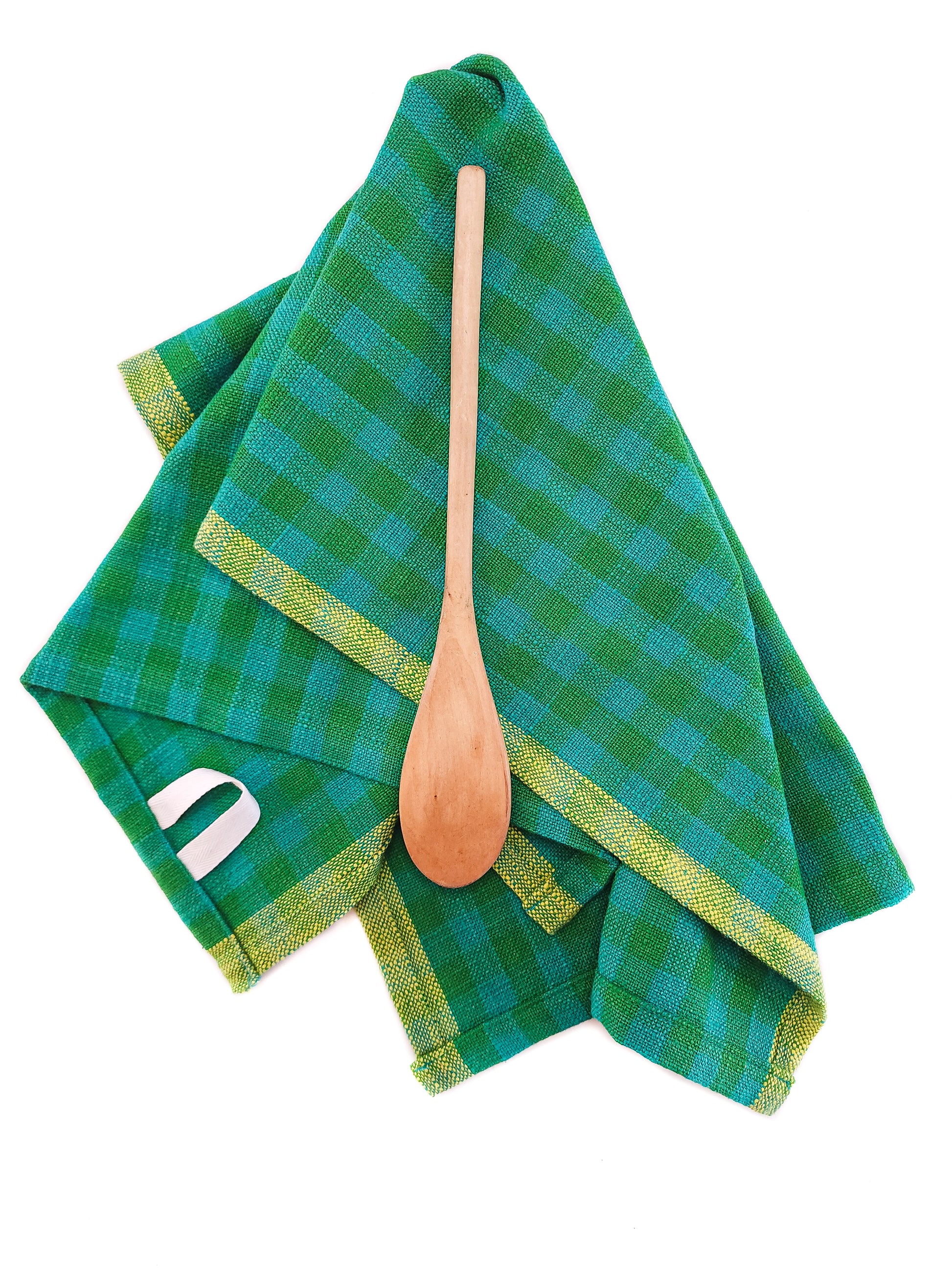 Add some joy and color to your kitchen with the practical and fun piece. This fun kitchen towel is 100% cotton, with a woven checkered pattern in teal and emerald green with a yellow border. It has a cotton loop for hanging on your favorite hook.