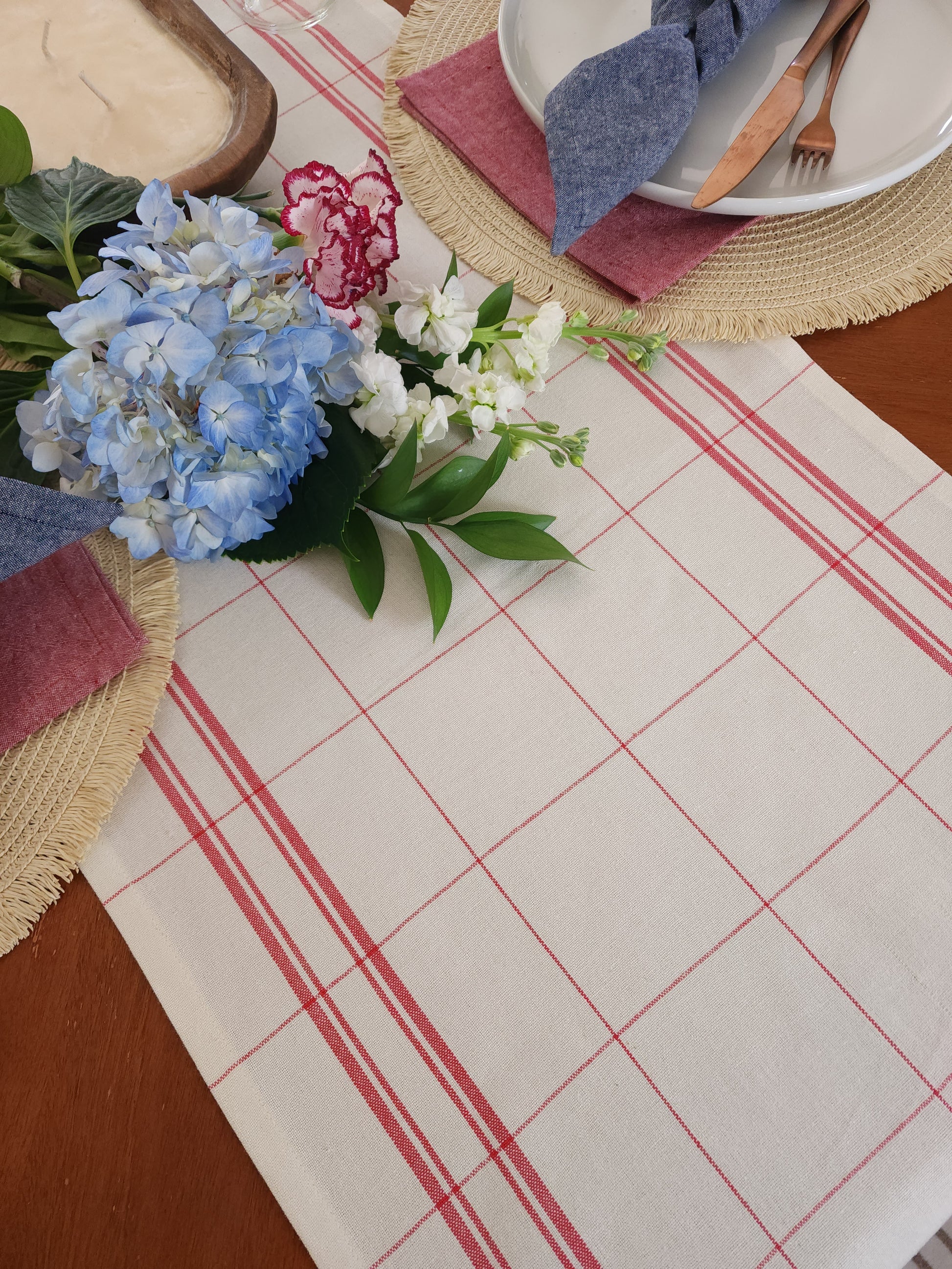 This ivory and red plaid table runner is a classic, vintage-inspired piece for your table settings. This runner is made of lightweight ivory 100% cotton with a woven red plaid pattern.