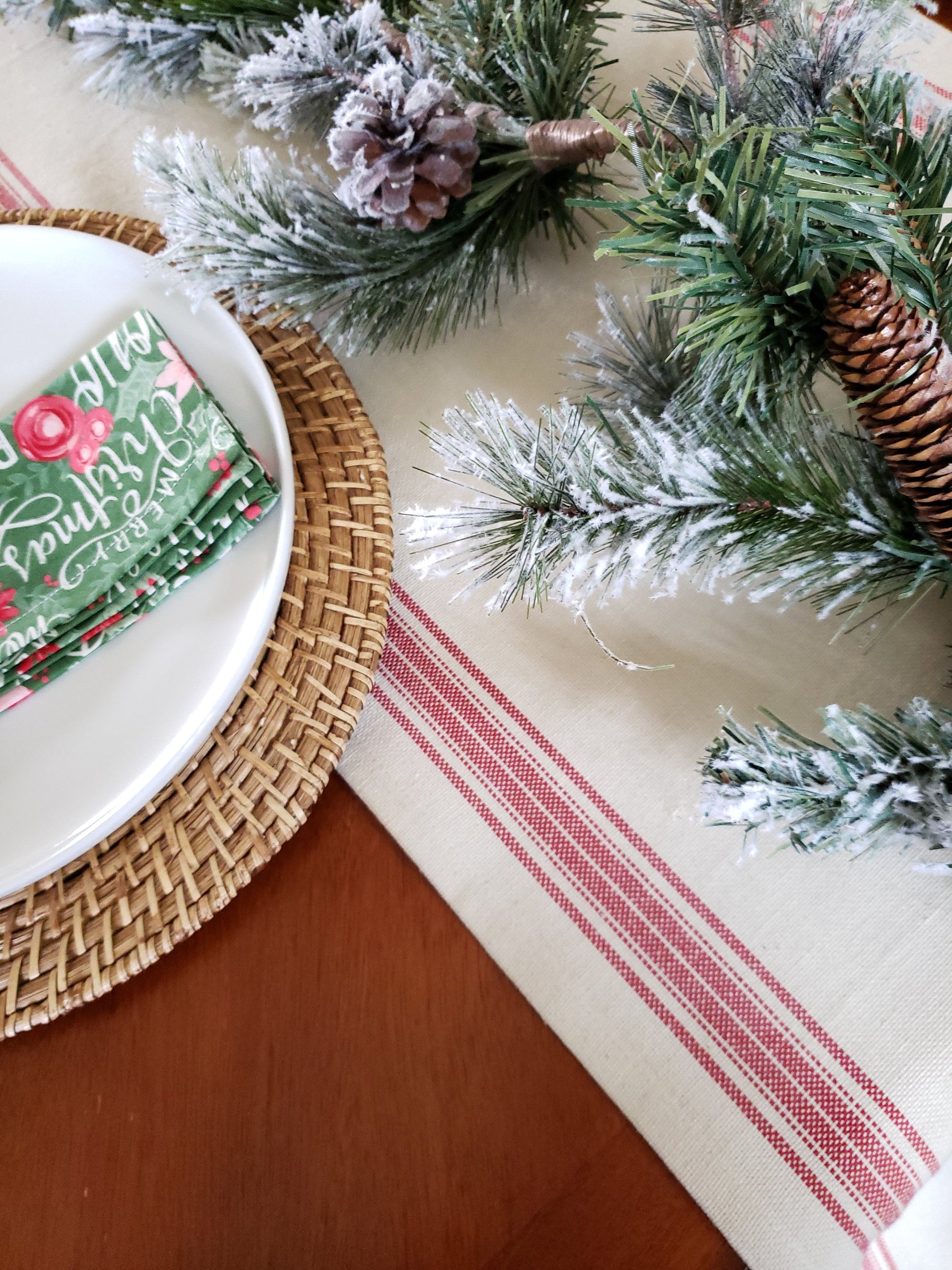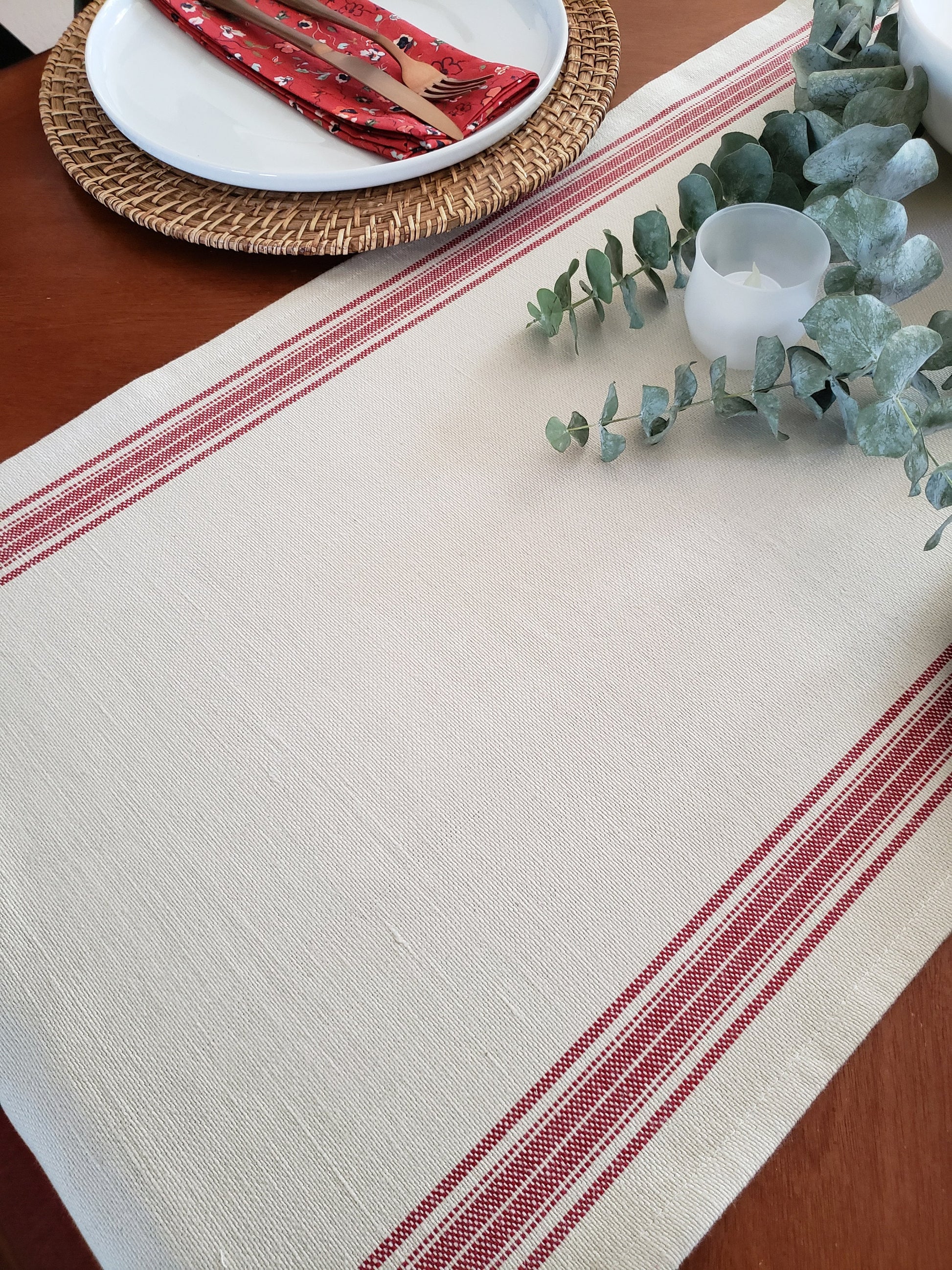 This red grain sack striped table runner is rustic and pretty for your farmhouse tablescape. It's perfect for everyday or holidays; you can dress it up or keep it simple. Made of thick 100% rustic beige colored cotton with woven red stripes. (Garland and other decor not included).