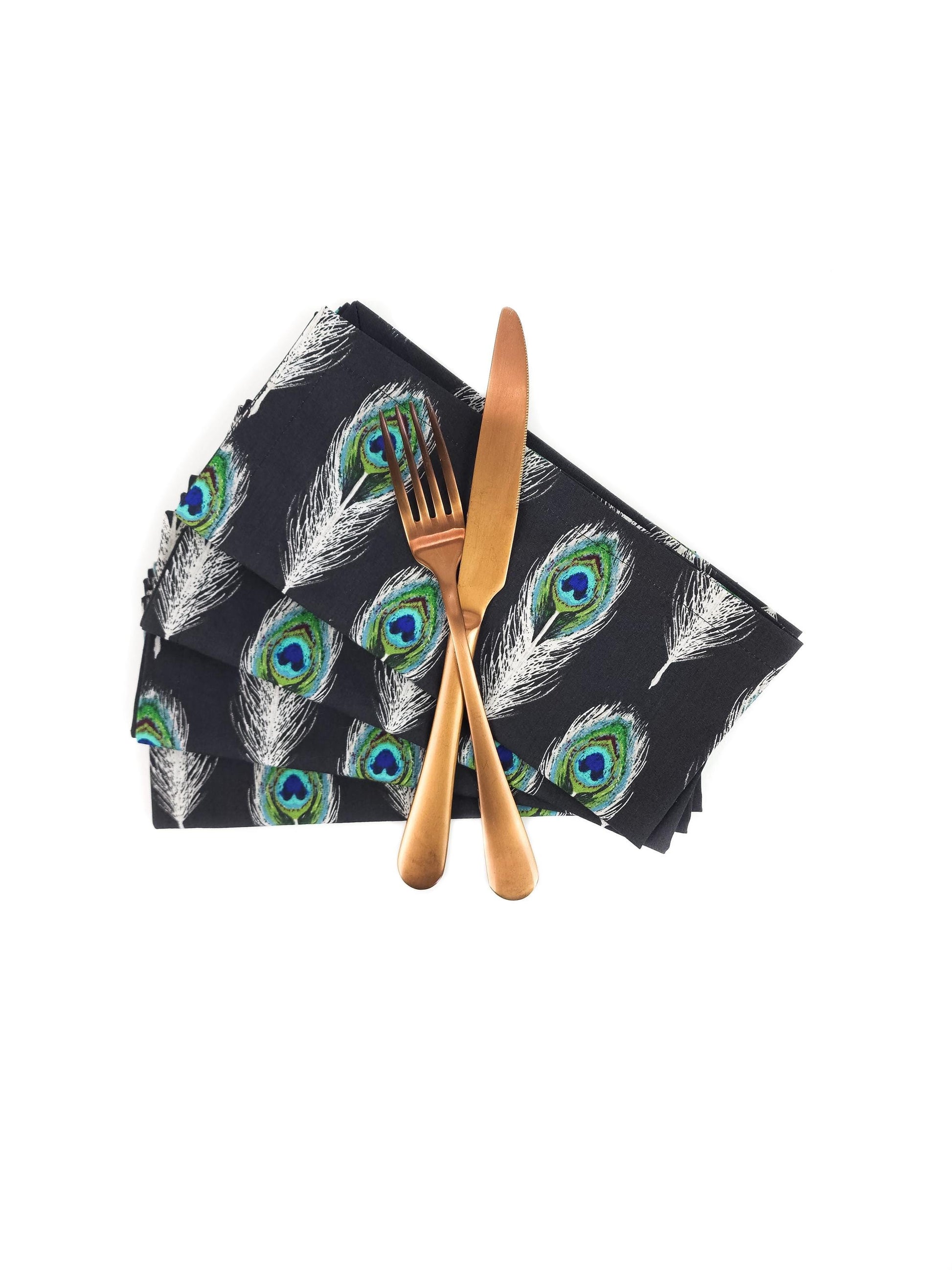 These dinner-sized cloth napkins are made of black cotton fabric with a gorgeous peacock feather print that adds richness and grace to your table setting. Peacocks have been revered for generations and are a symbol of beauty, rebirth, and royalty. Sold as a set of 4 napkins.