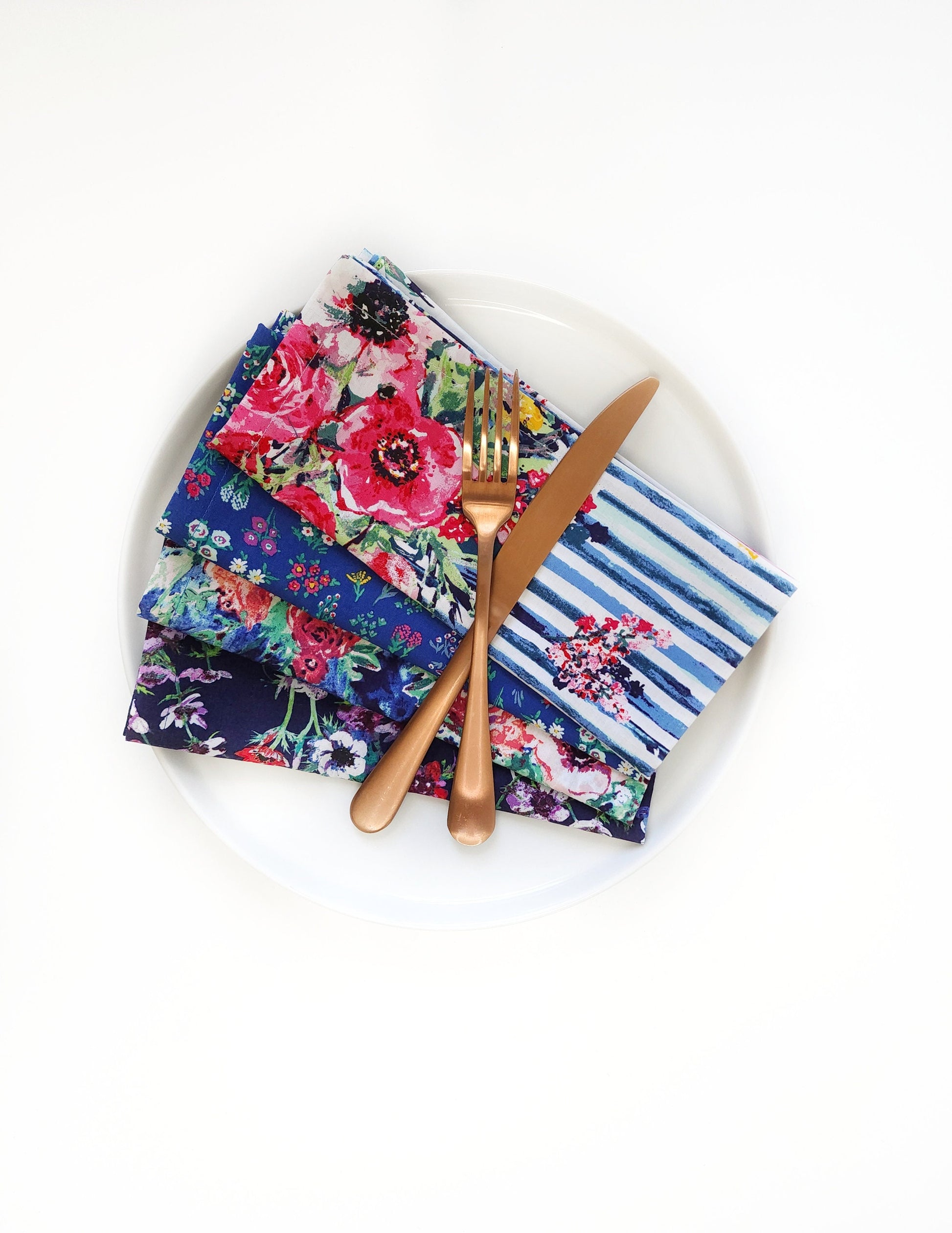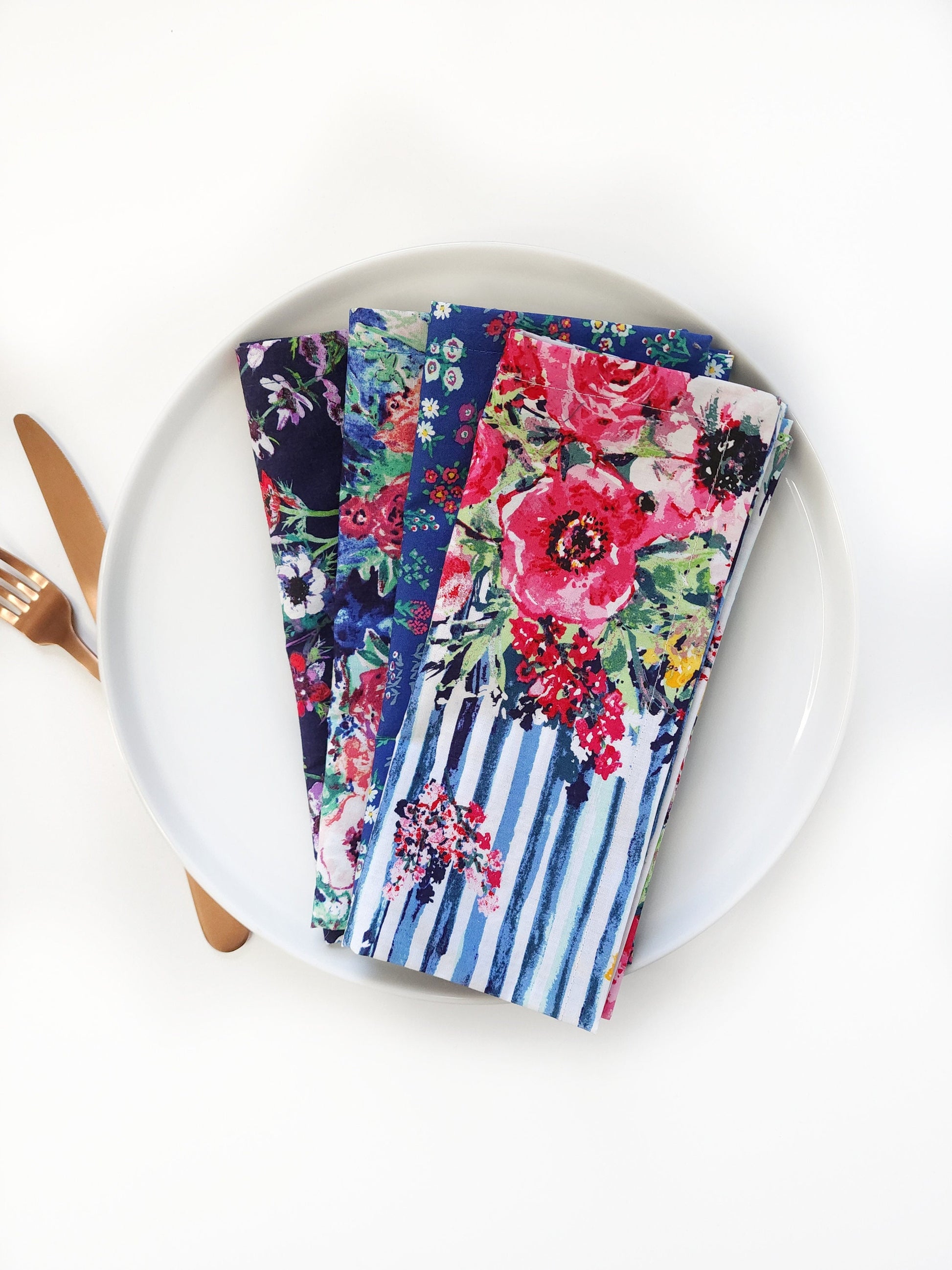 Prepare to set a lovely table setting with this set of 4 mix and match cloth napkins that has charming and bright floral patterns in a blue theme.