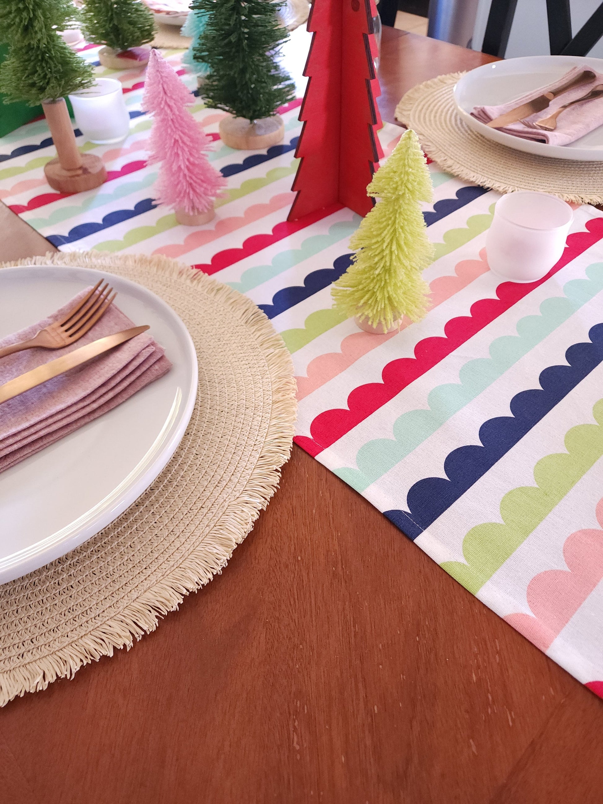 This whimsical runner is happiness for your table. Made of 100% cotton with printed colorful scalloped stripes in blue, peach, green, and red. This runner is the perfect foundation for your colorful table setting and can be used year-round for festive occasions, birthdays, and any time your table needs a pop of color.