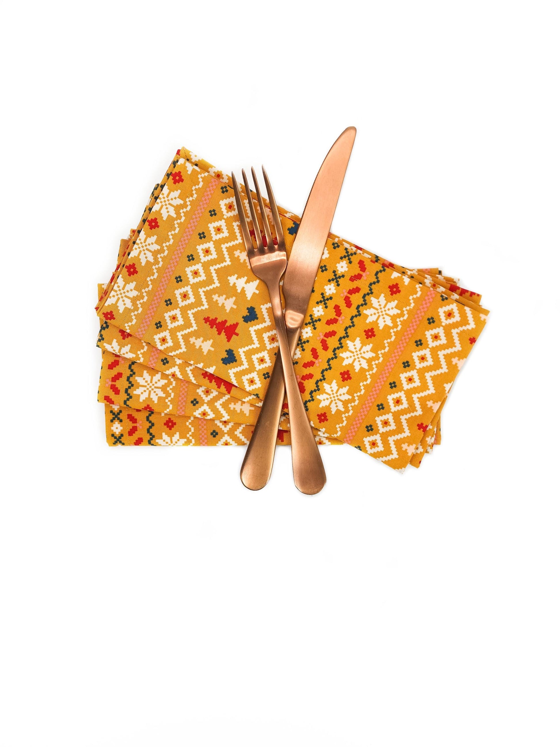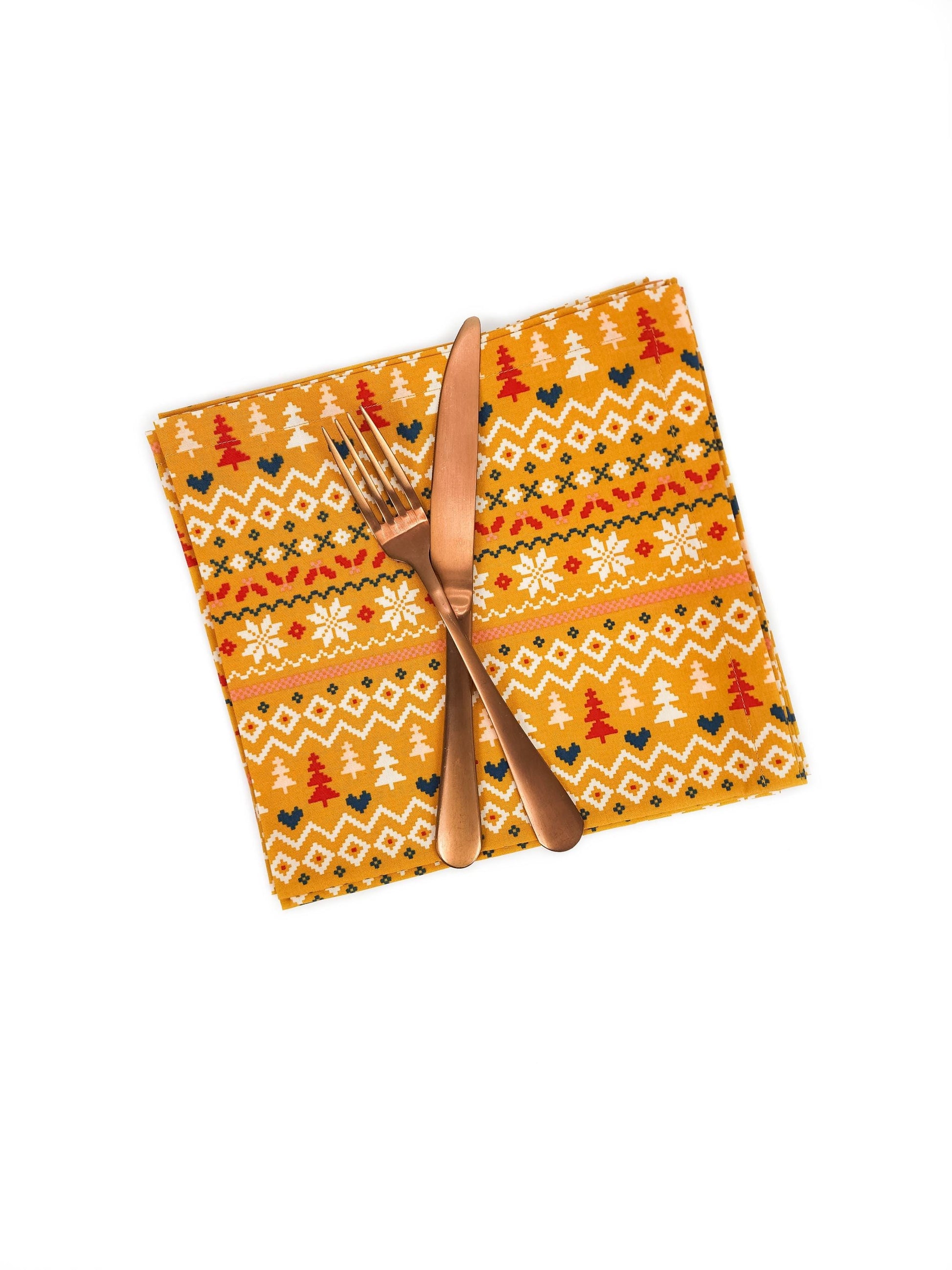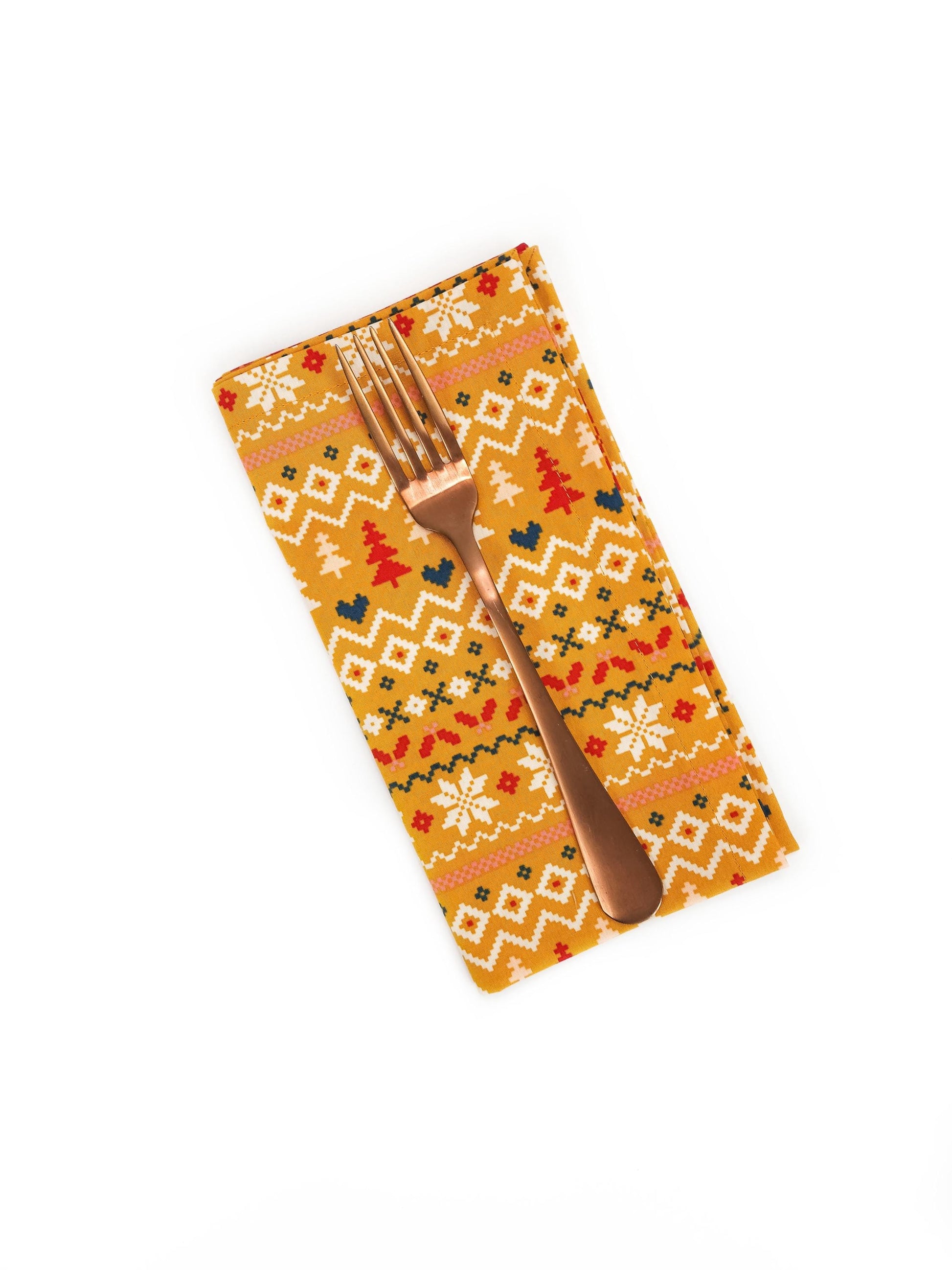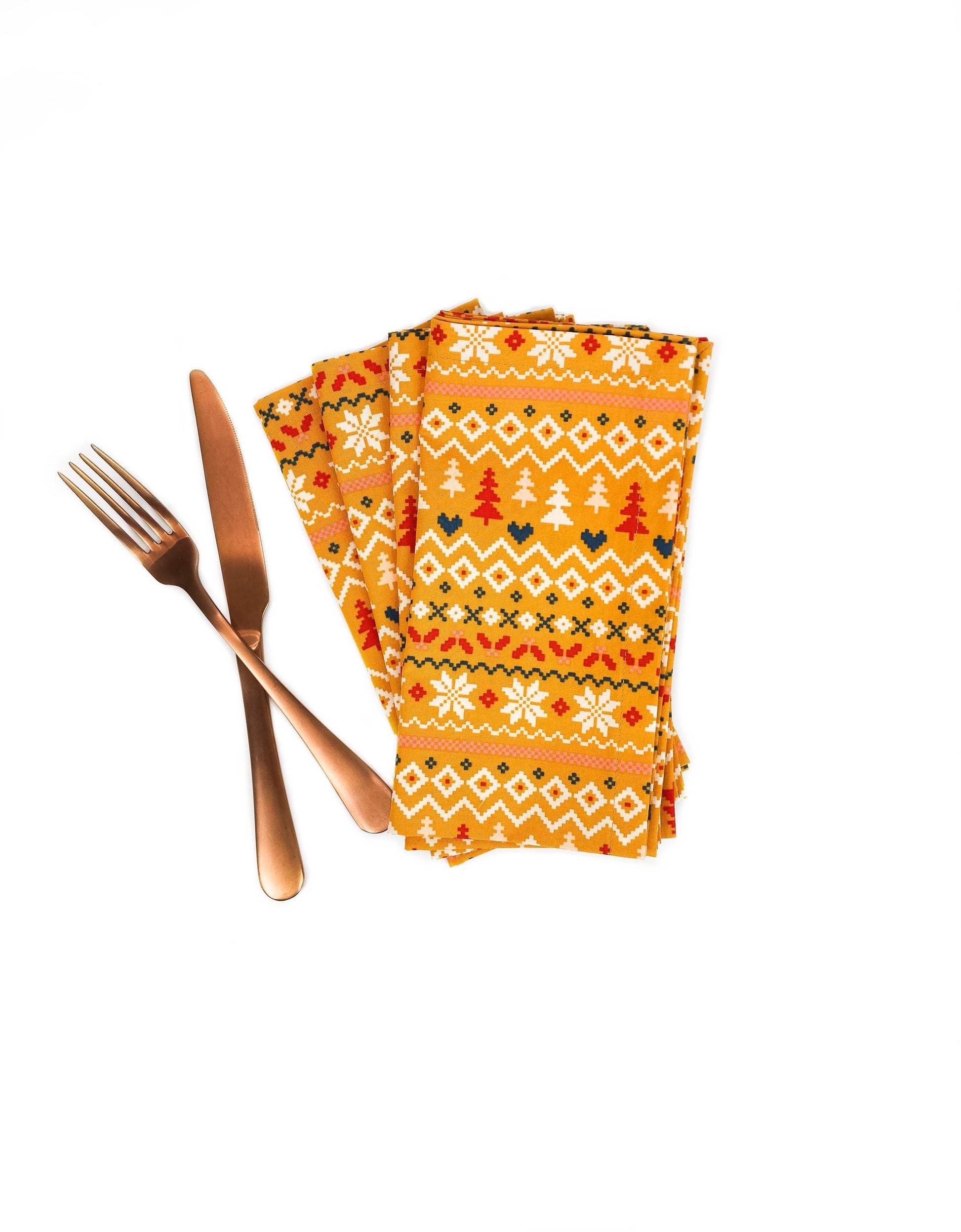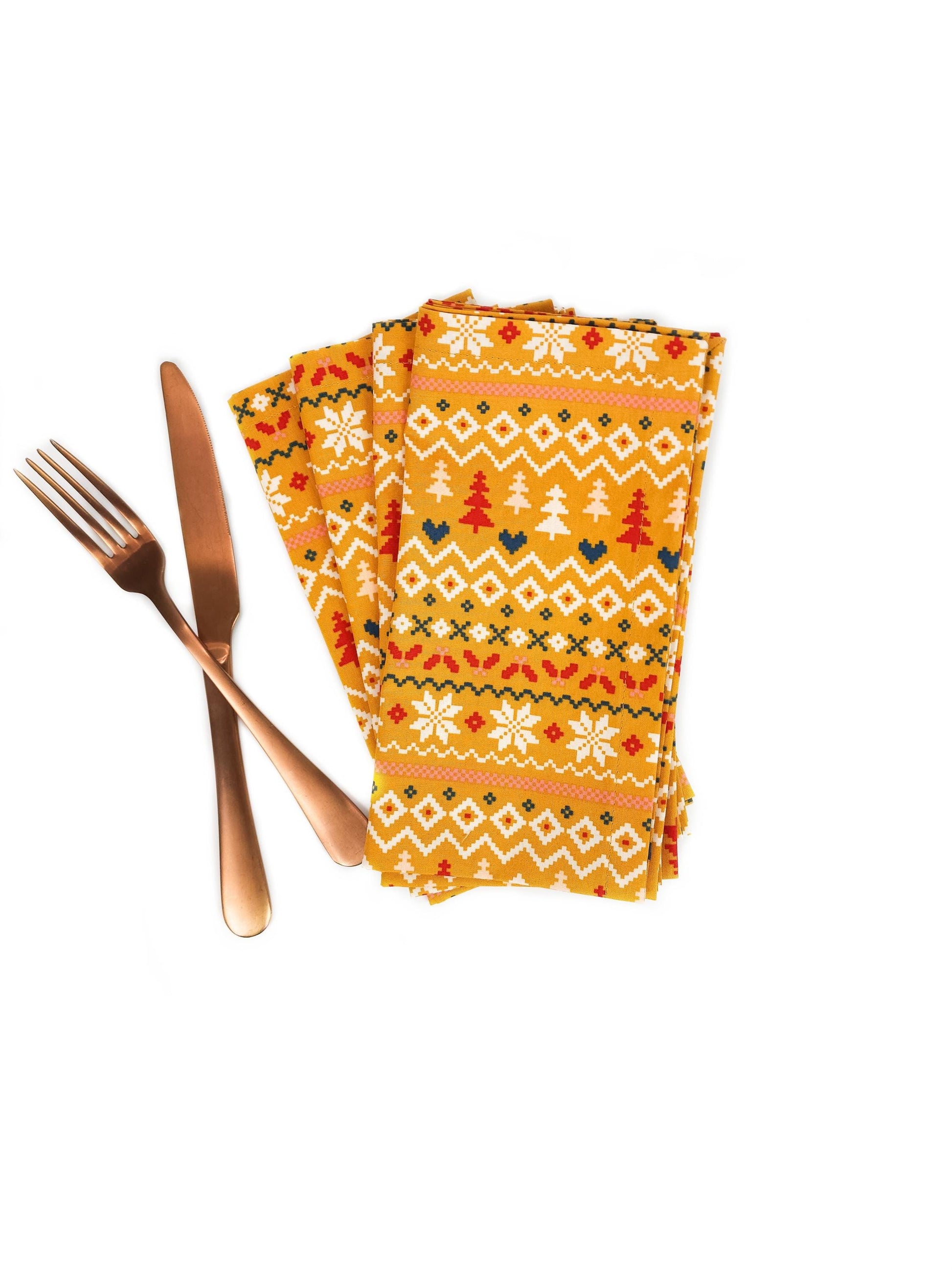 This set of 4 gold Christmas napkins has a traditional Faire Isle pattern in a modern gold colorway. These napkins are fun for everyday use during the holiday season or for Christmas dinner.