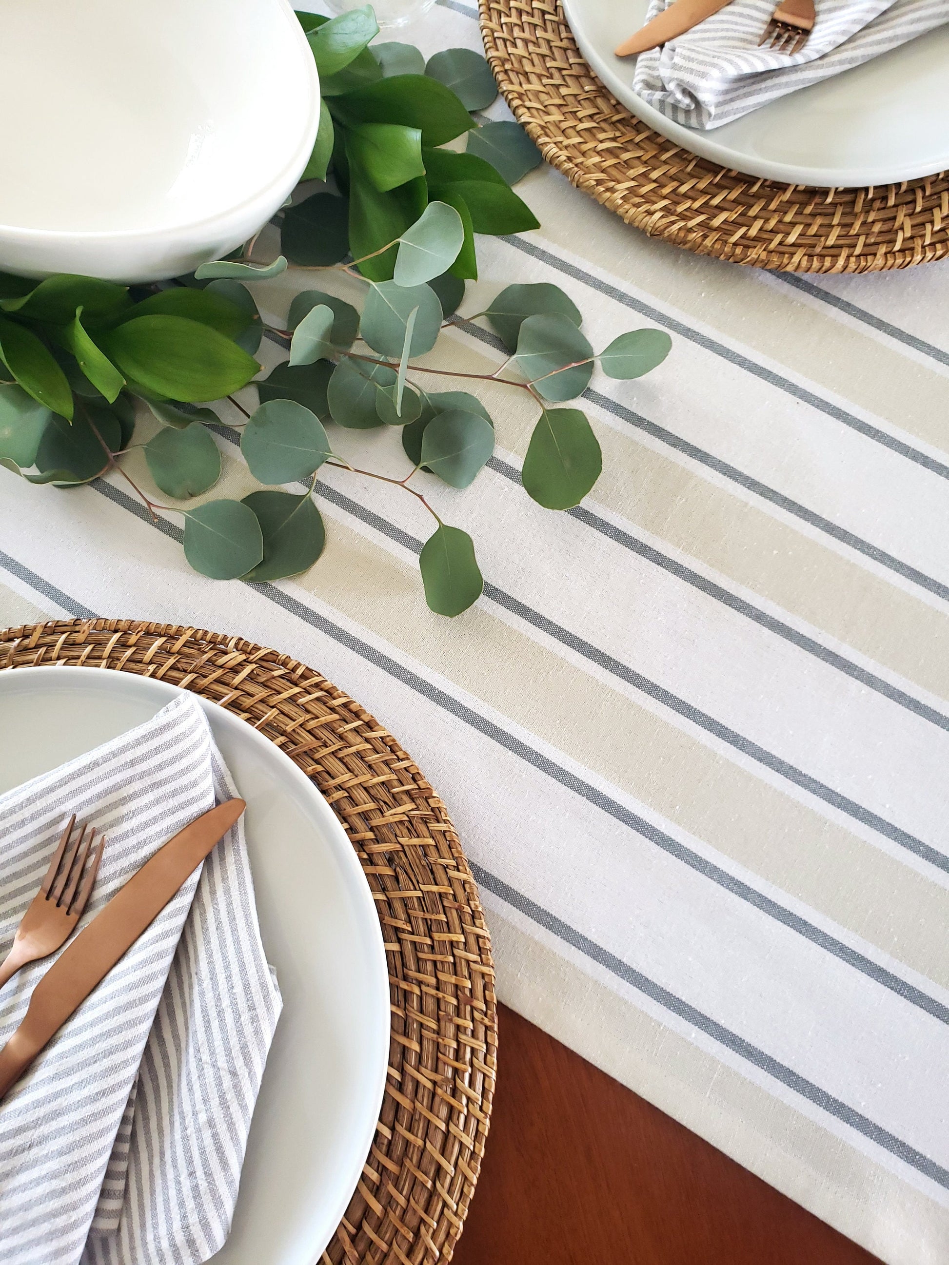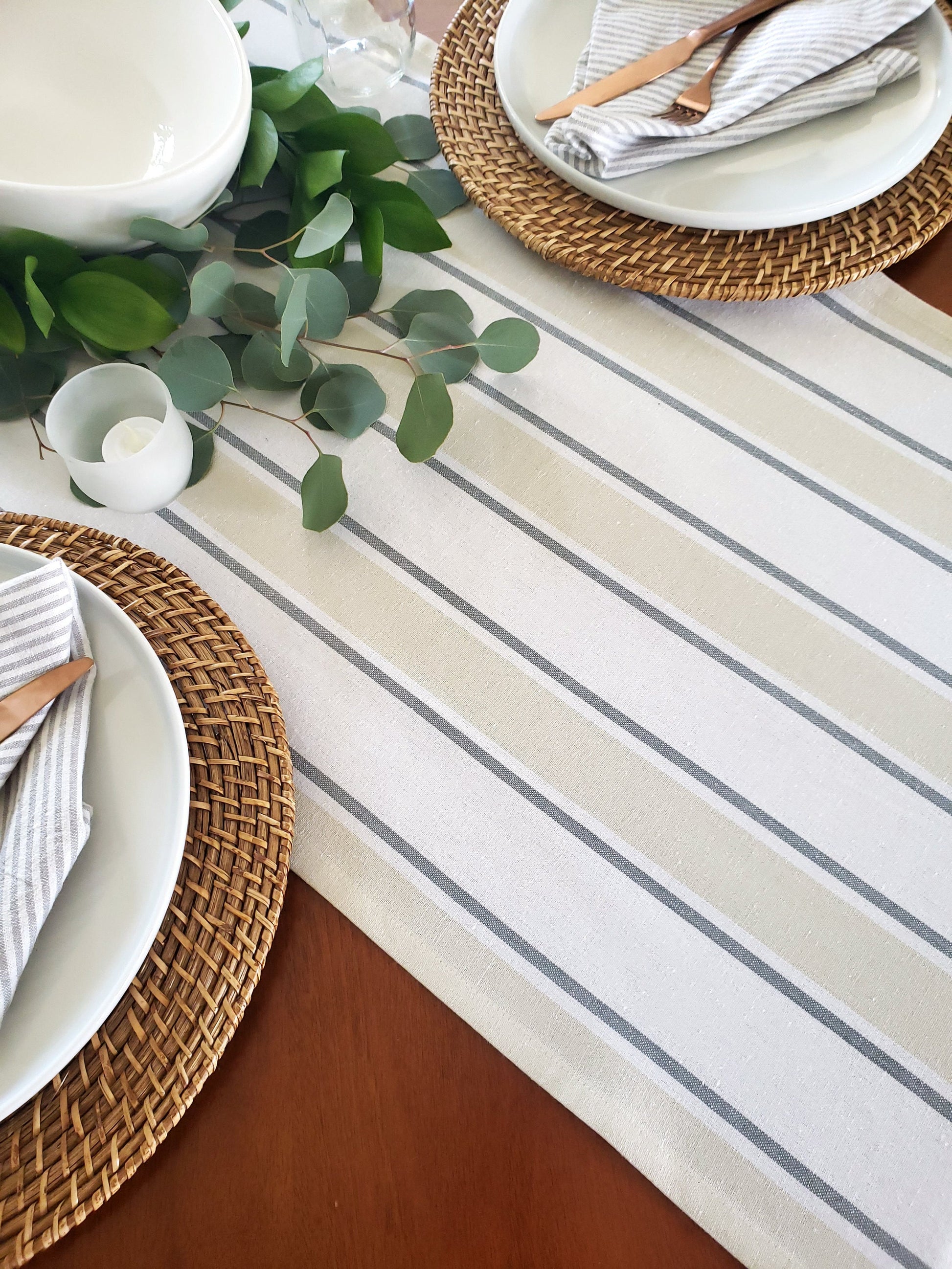 This table runner is a beautiful addition to your table top with white, sandy beige, and gray stripes This runner is made of lightweight 100% cotton that's machine washable.
