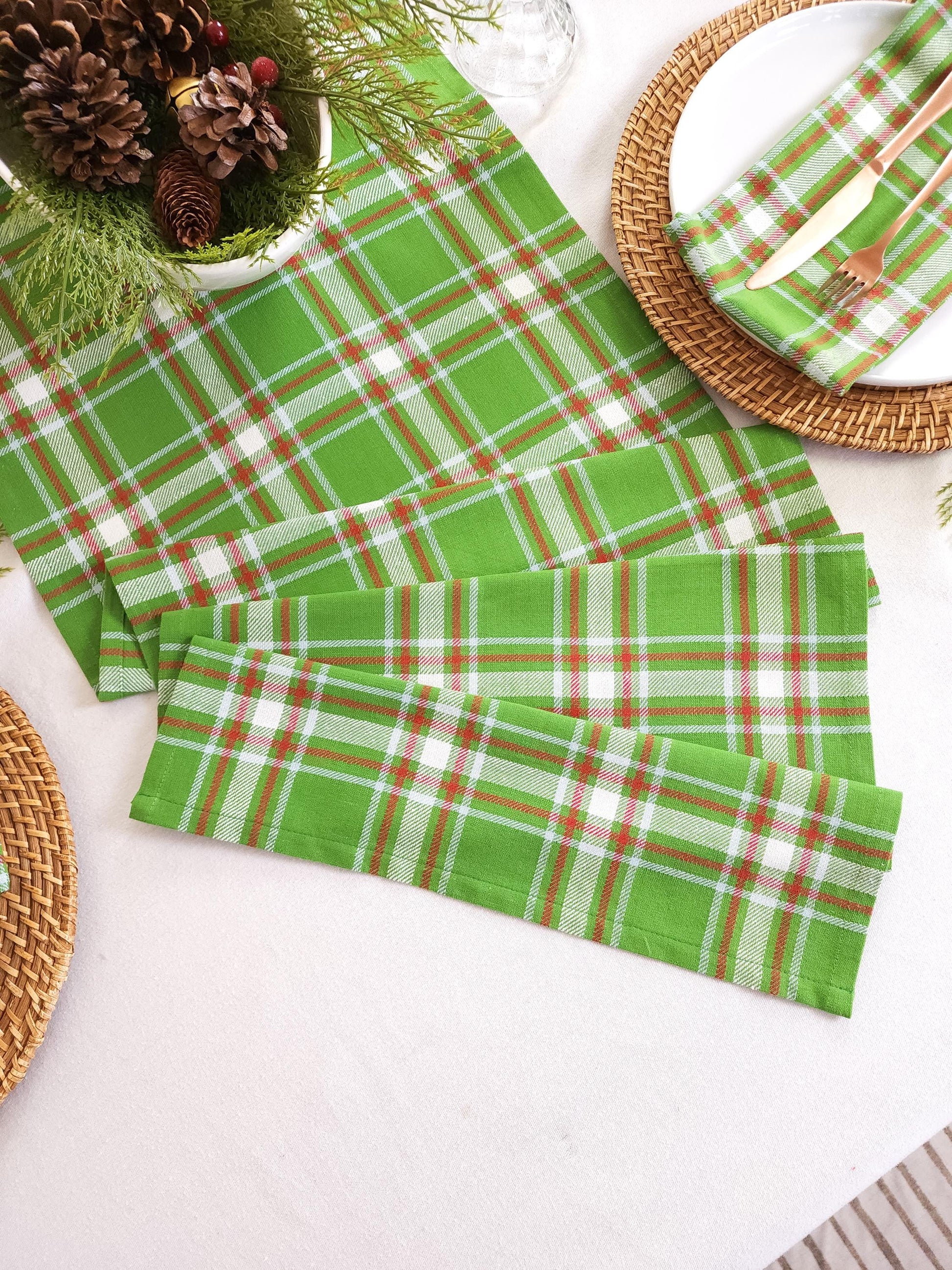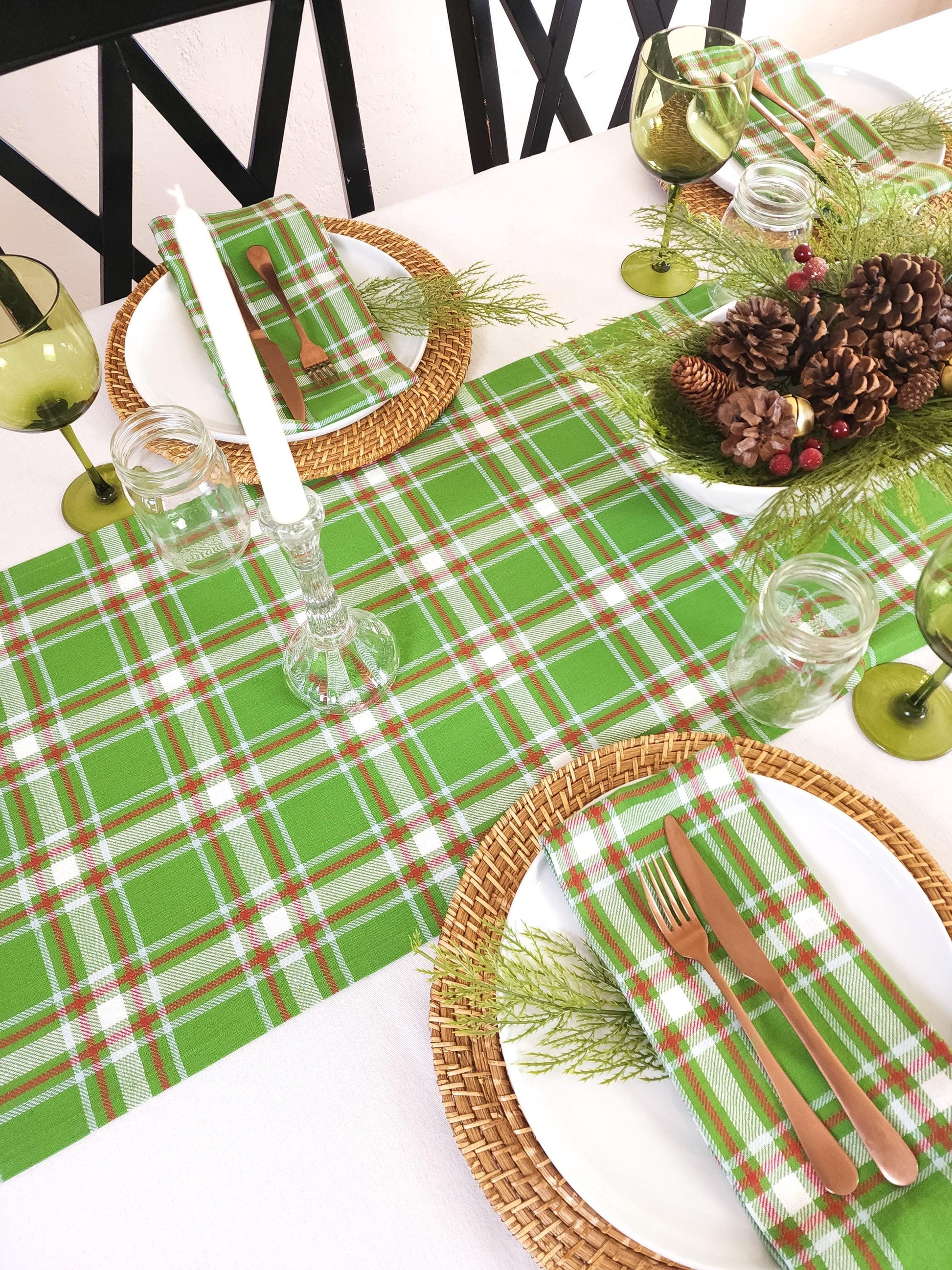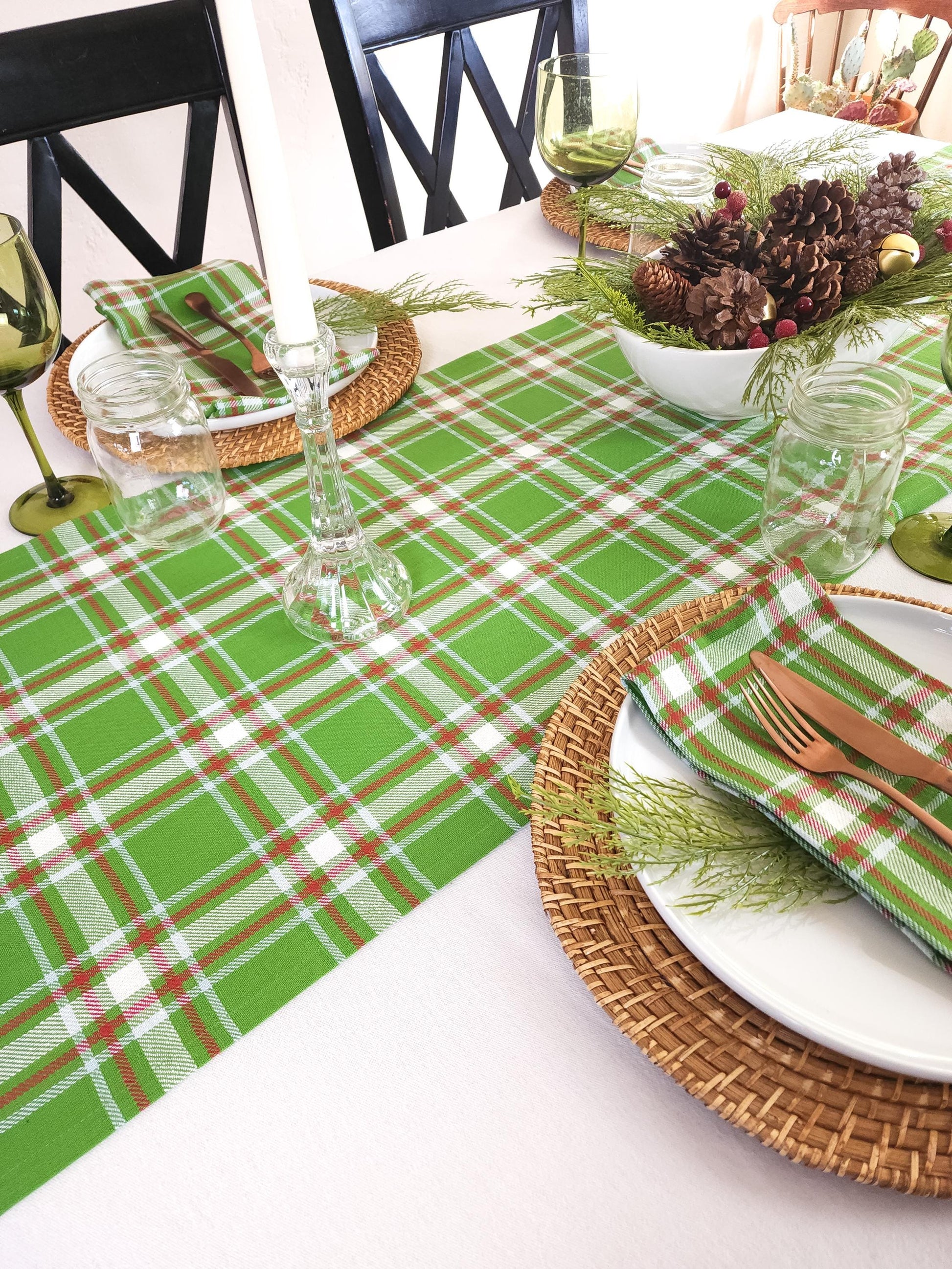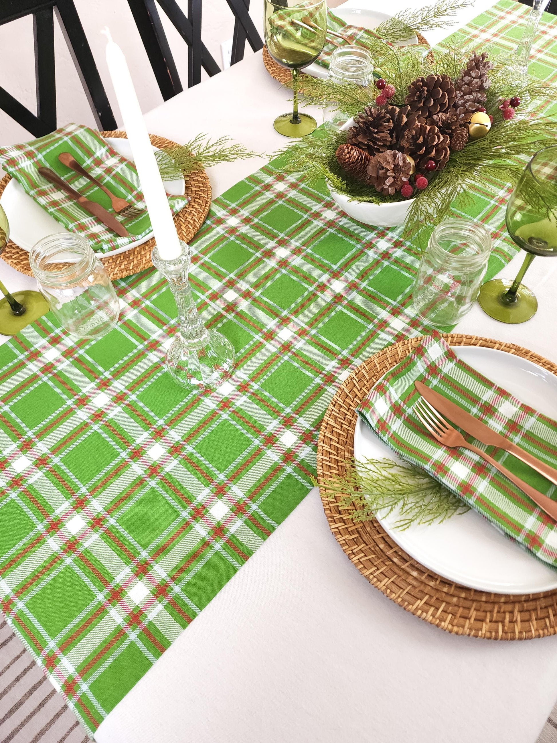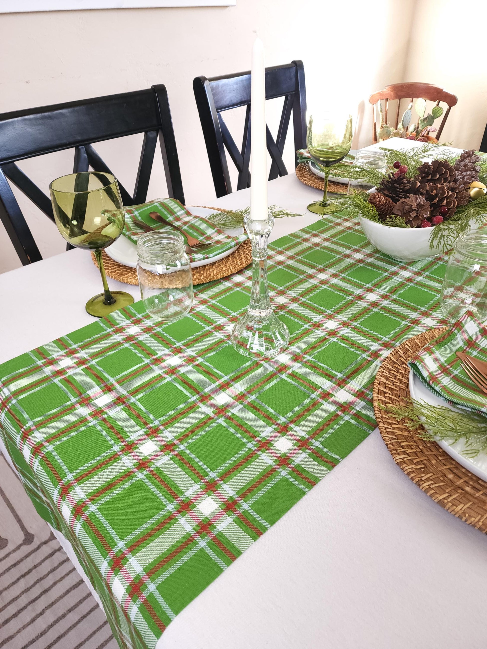 This green plaid table runner is bright and cheery for your holiday season table. This Christmas table runner is made of softened 100% cotton that's green, red, and white.