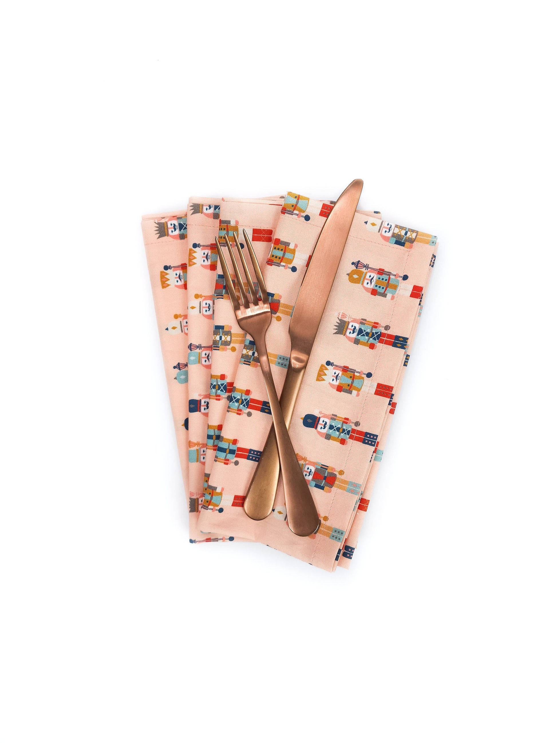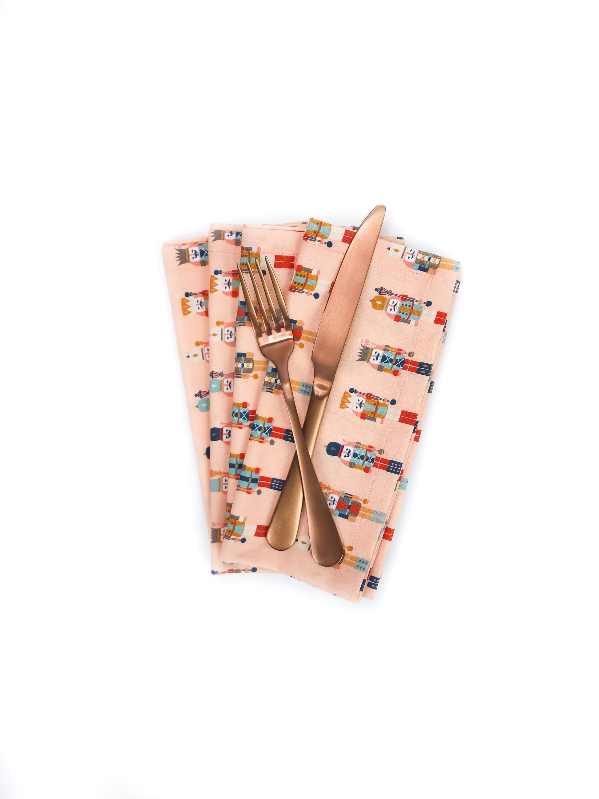 This set of 4 Christmas cloth napkins has charming nutcrackers standing at attention on a peachy pink cotton background. Bring a touch of whimsy and color to your holiday table with these napkins that are fun for everyday use during the holiday season or for Christmas dinner.