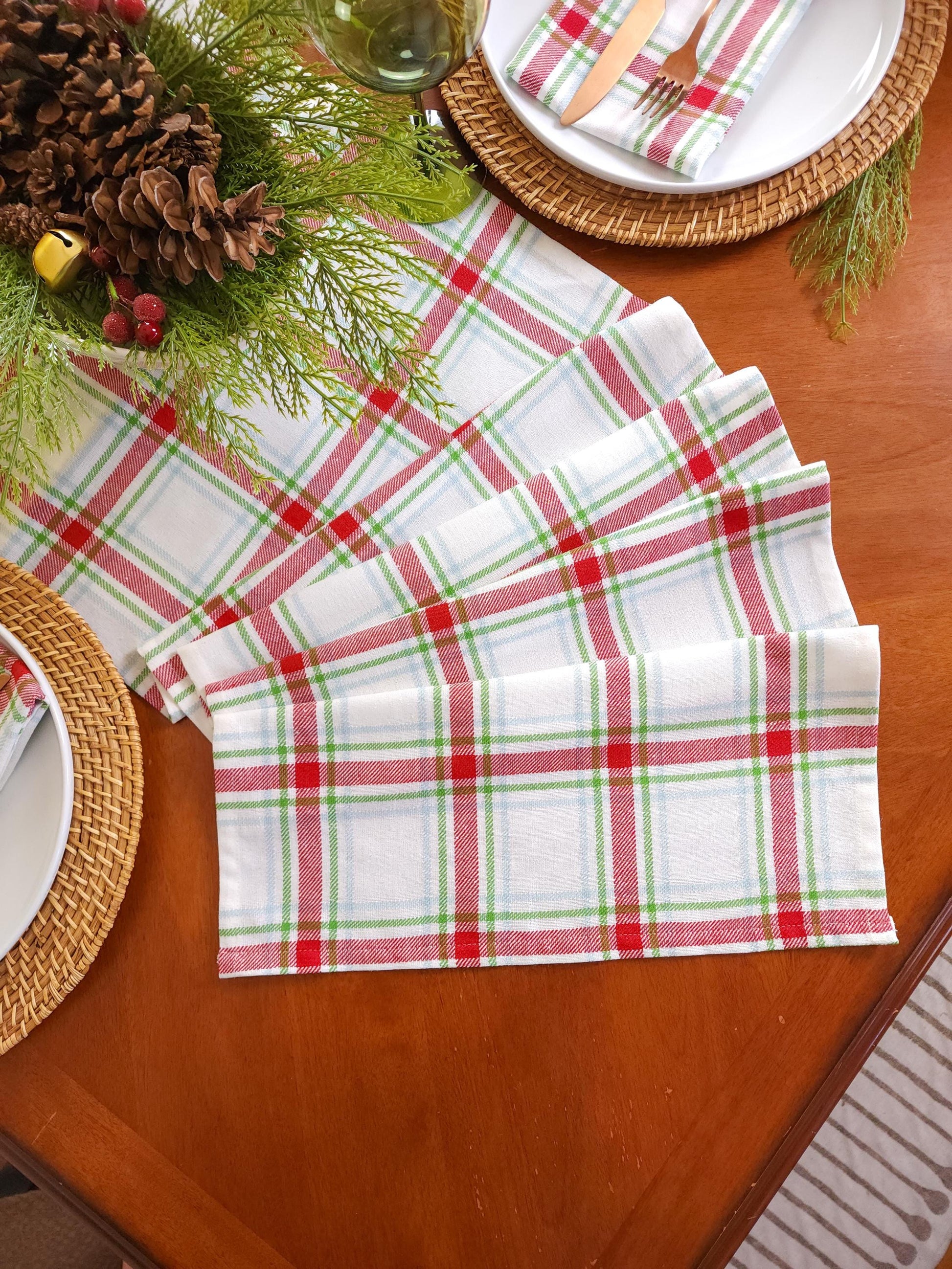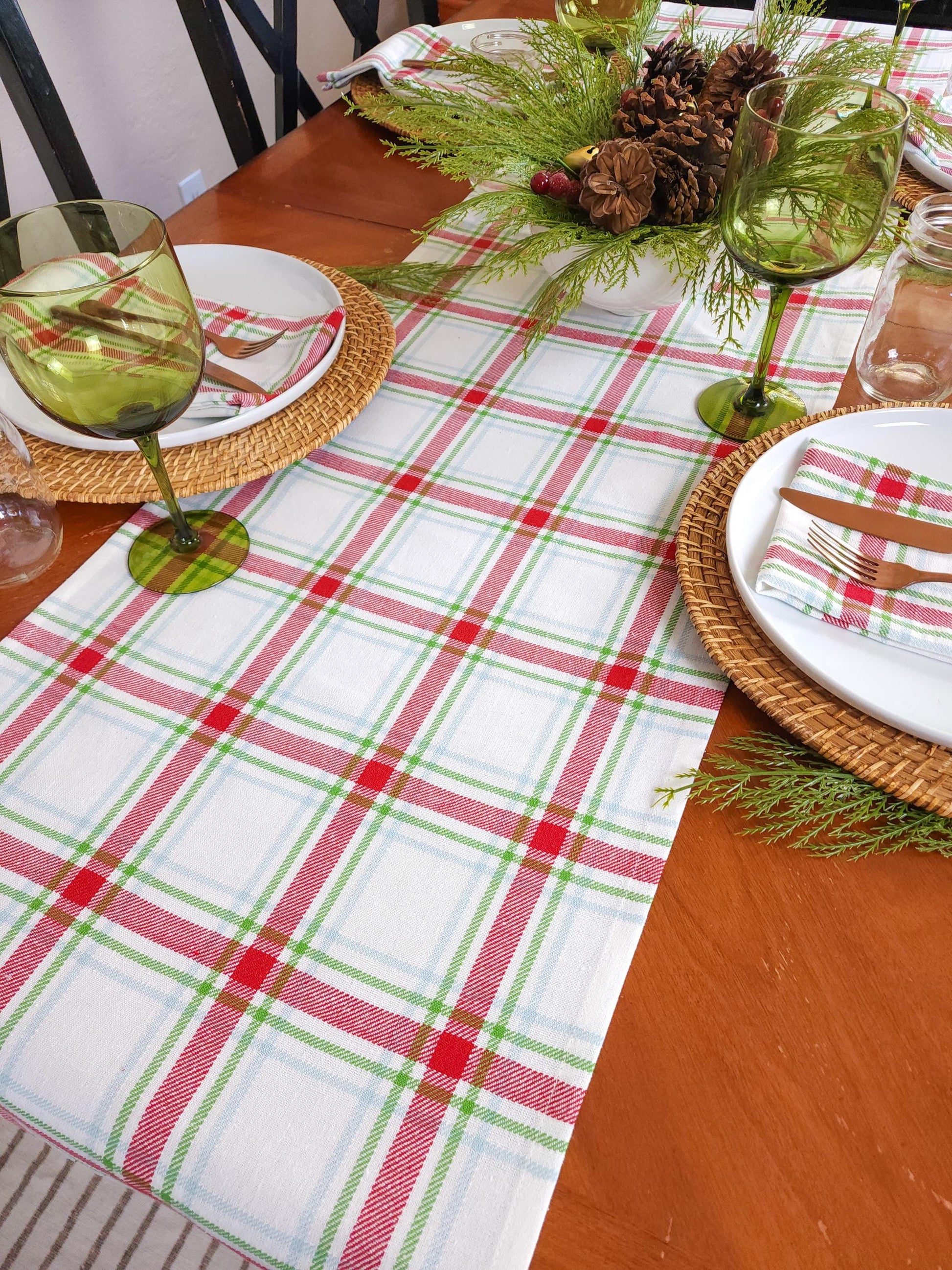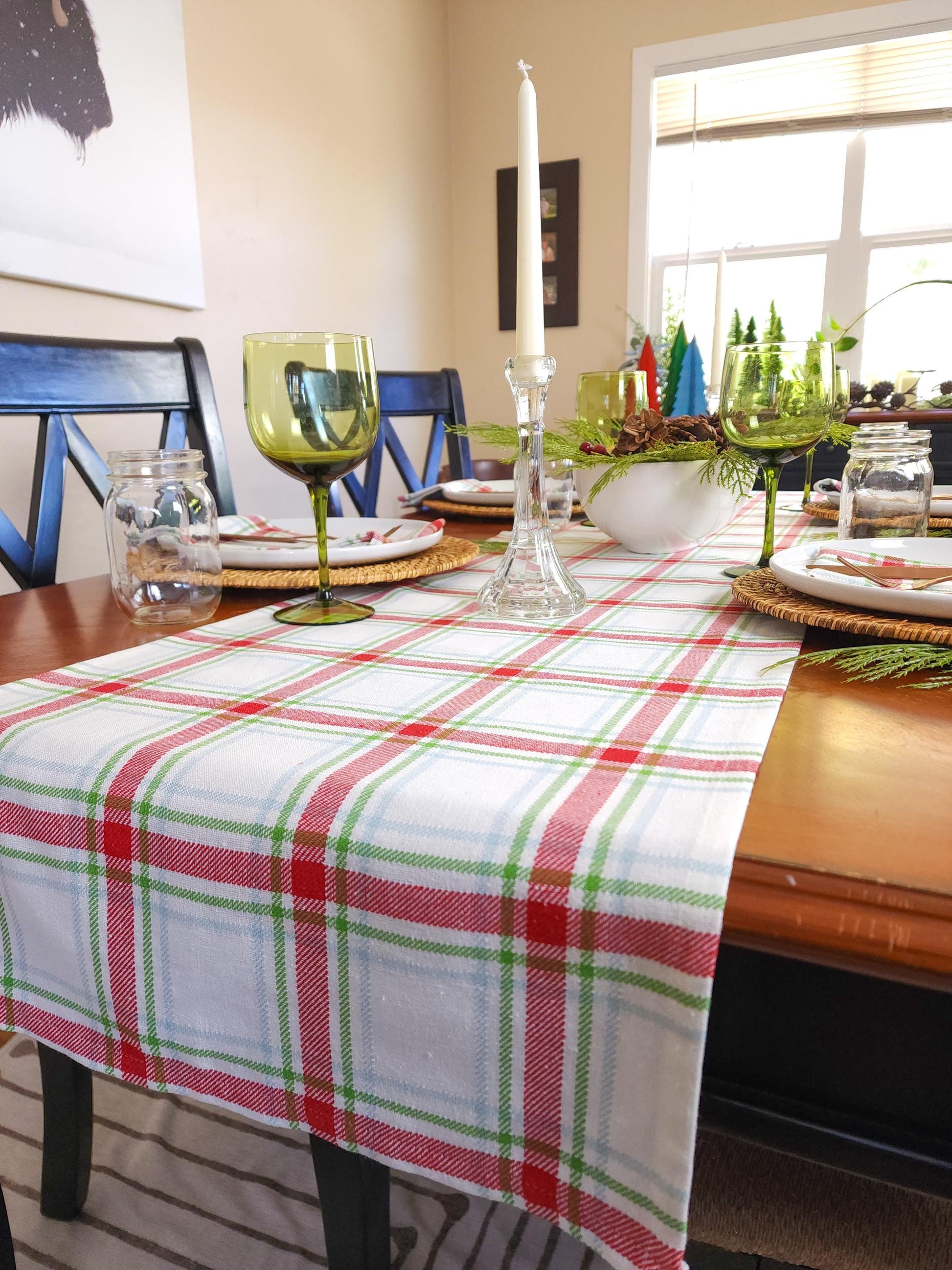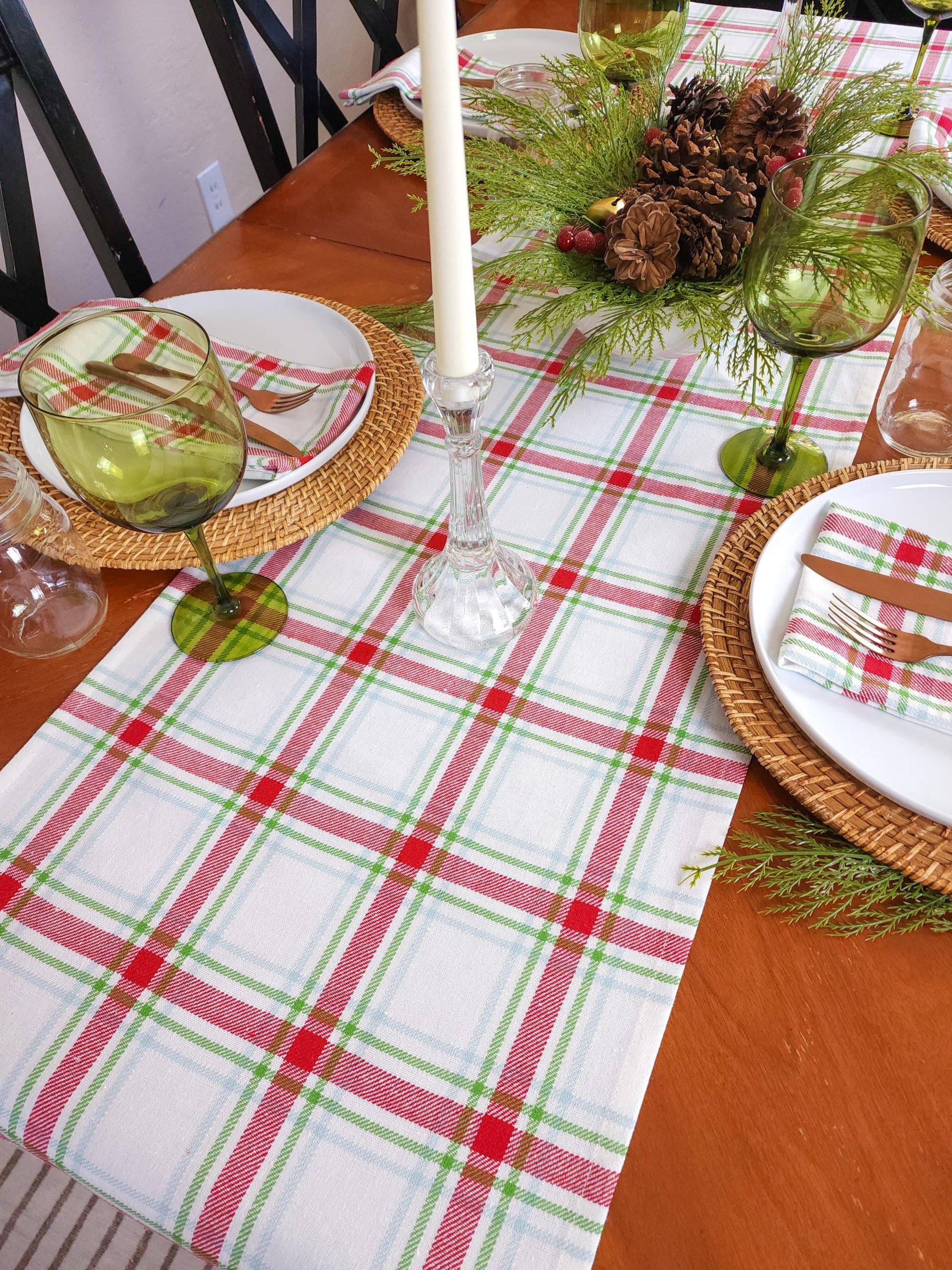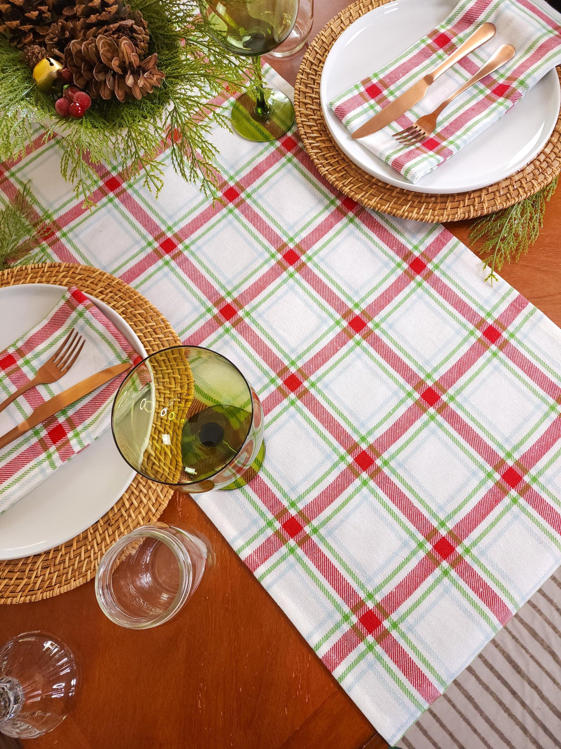 This plaid table runner is modern and fun for your holiday table. The runner is made of softened 100% cotton that's ivory, red, green, and pale blue for a lovely and modern take on Christmas plaid.