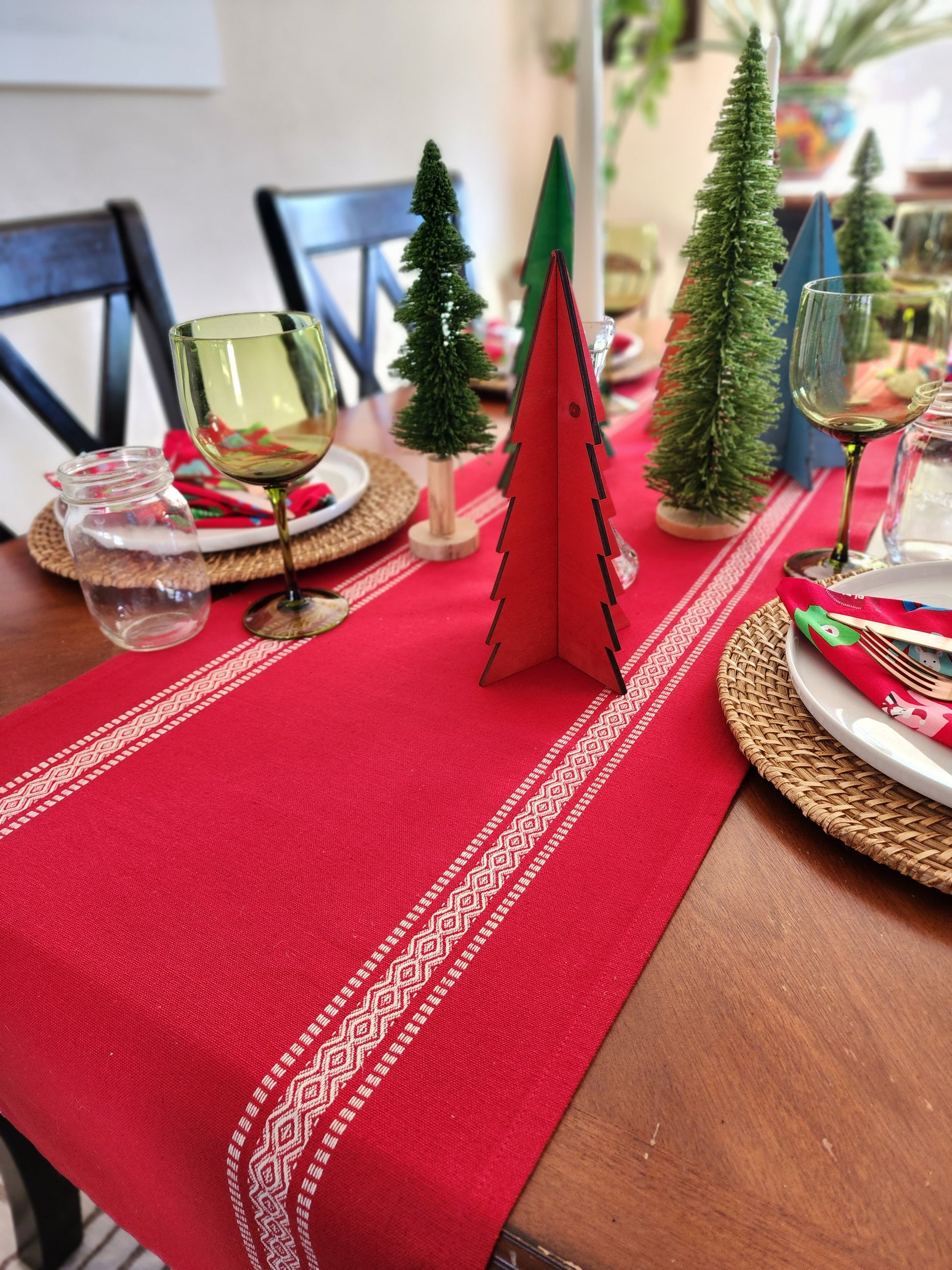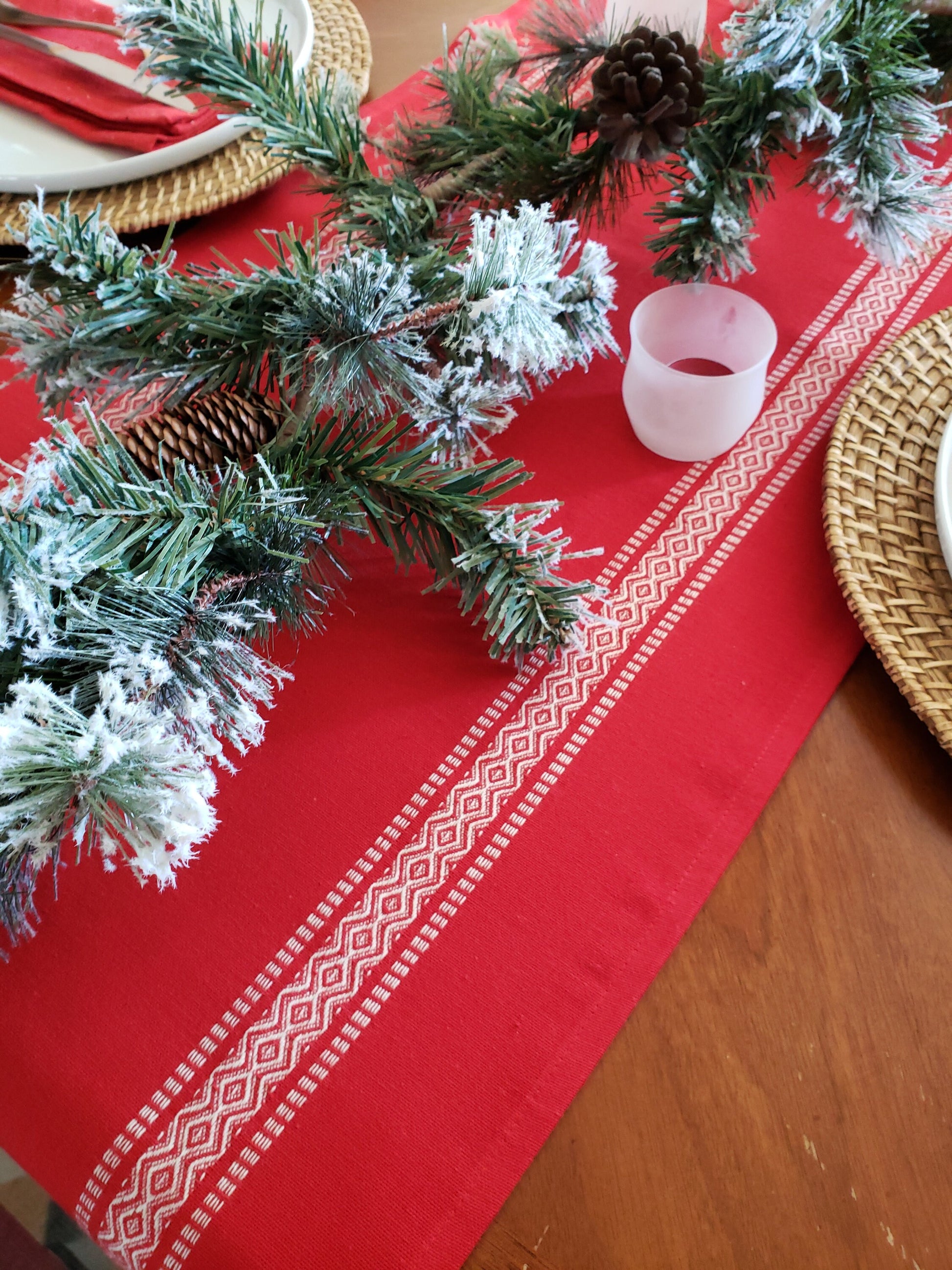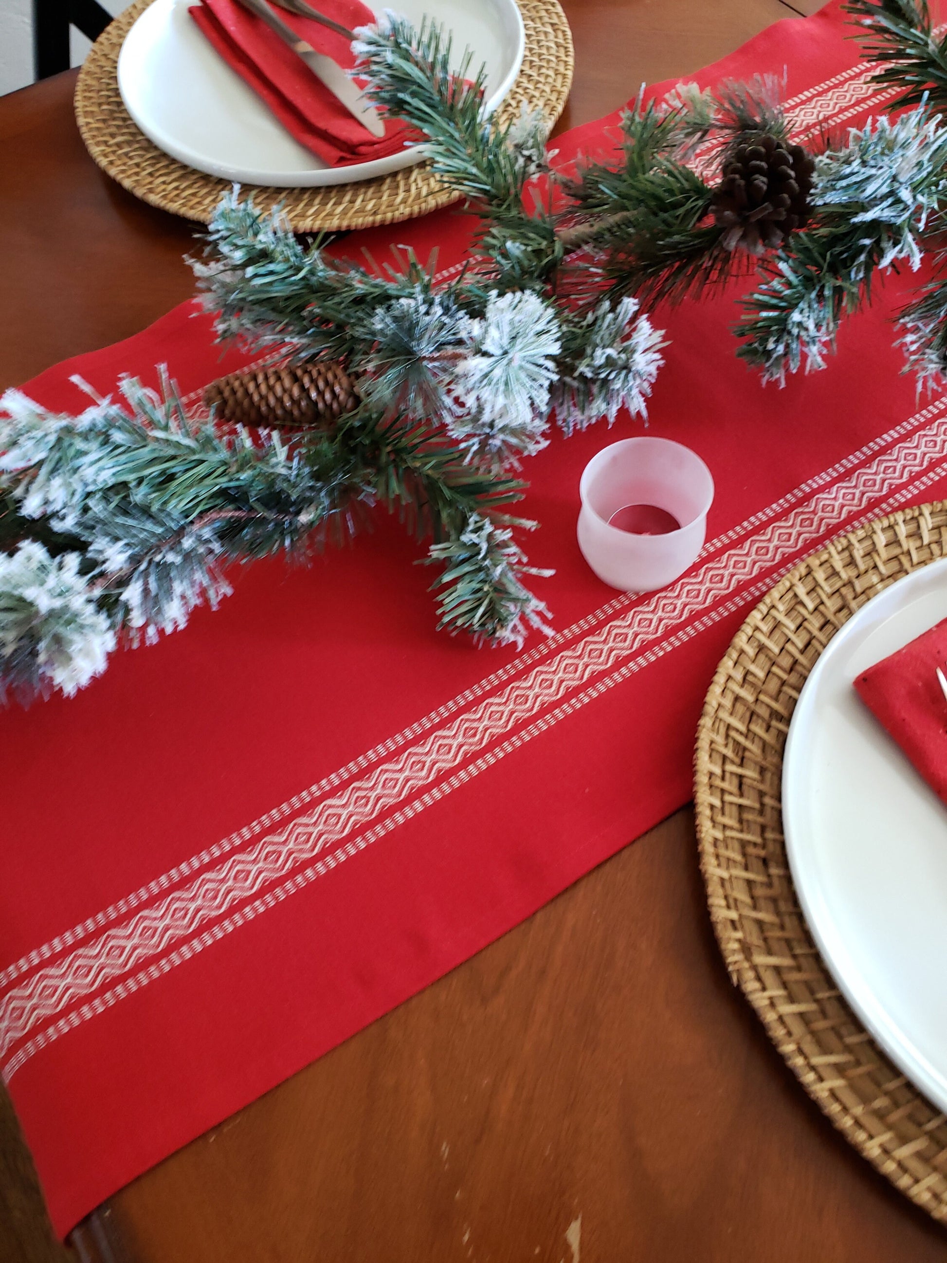 This red Scandinavian-inspired table runner is bright and pretty for your holiday table settings. Made of soft red 100% cotton with a woven white scandinavian pattern on each side.