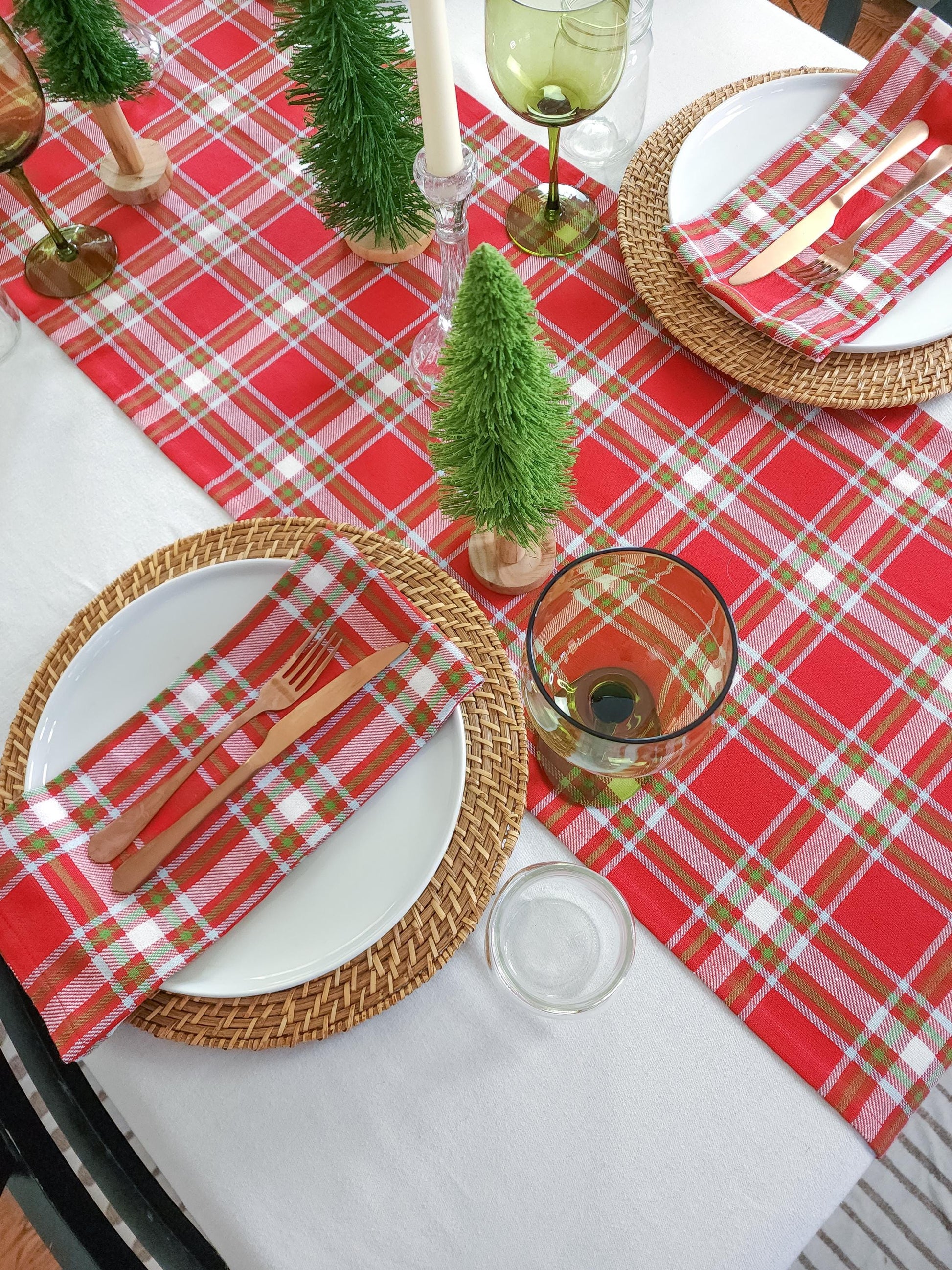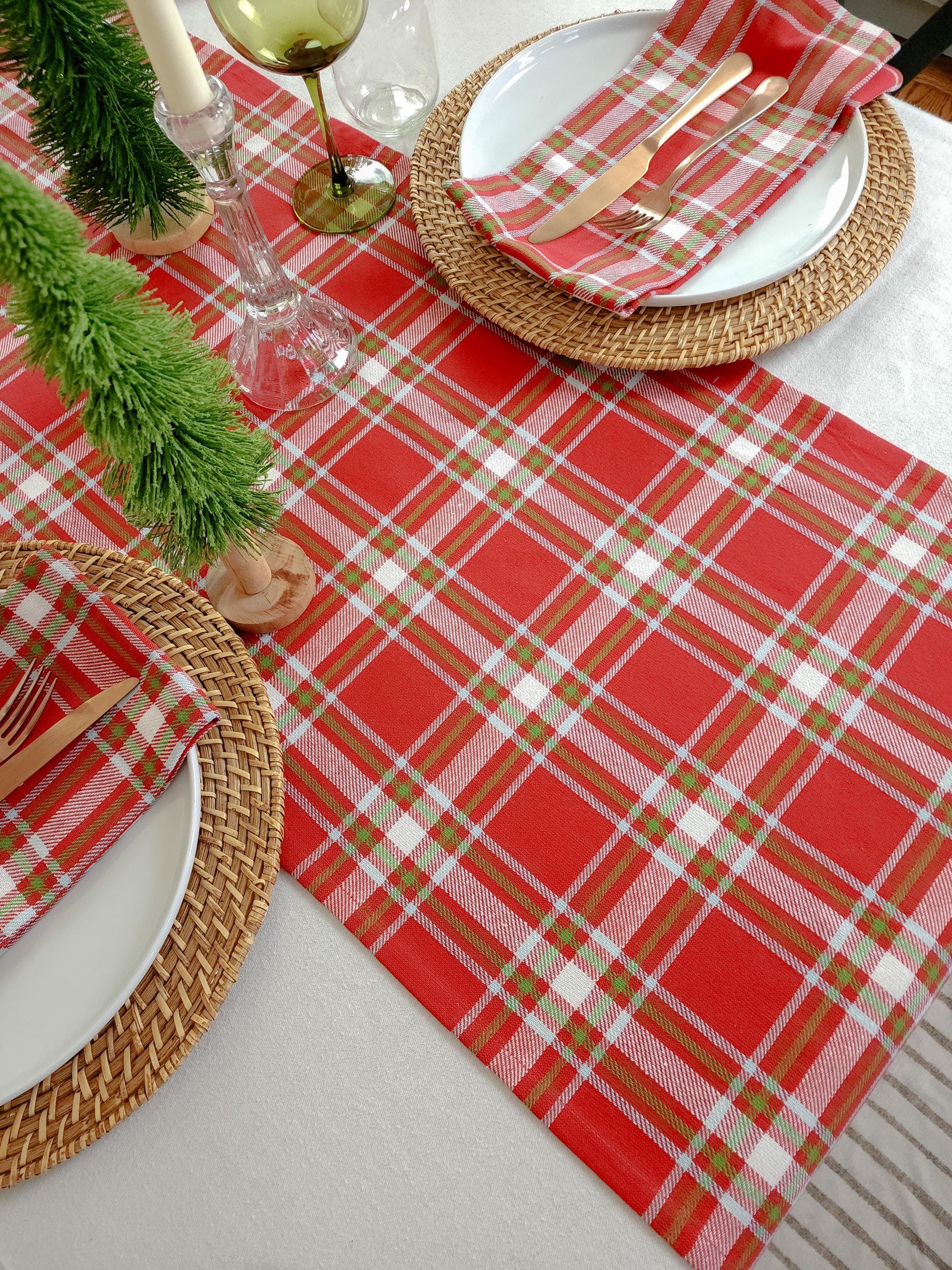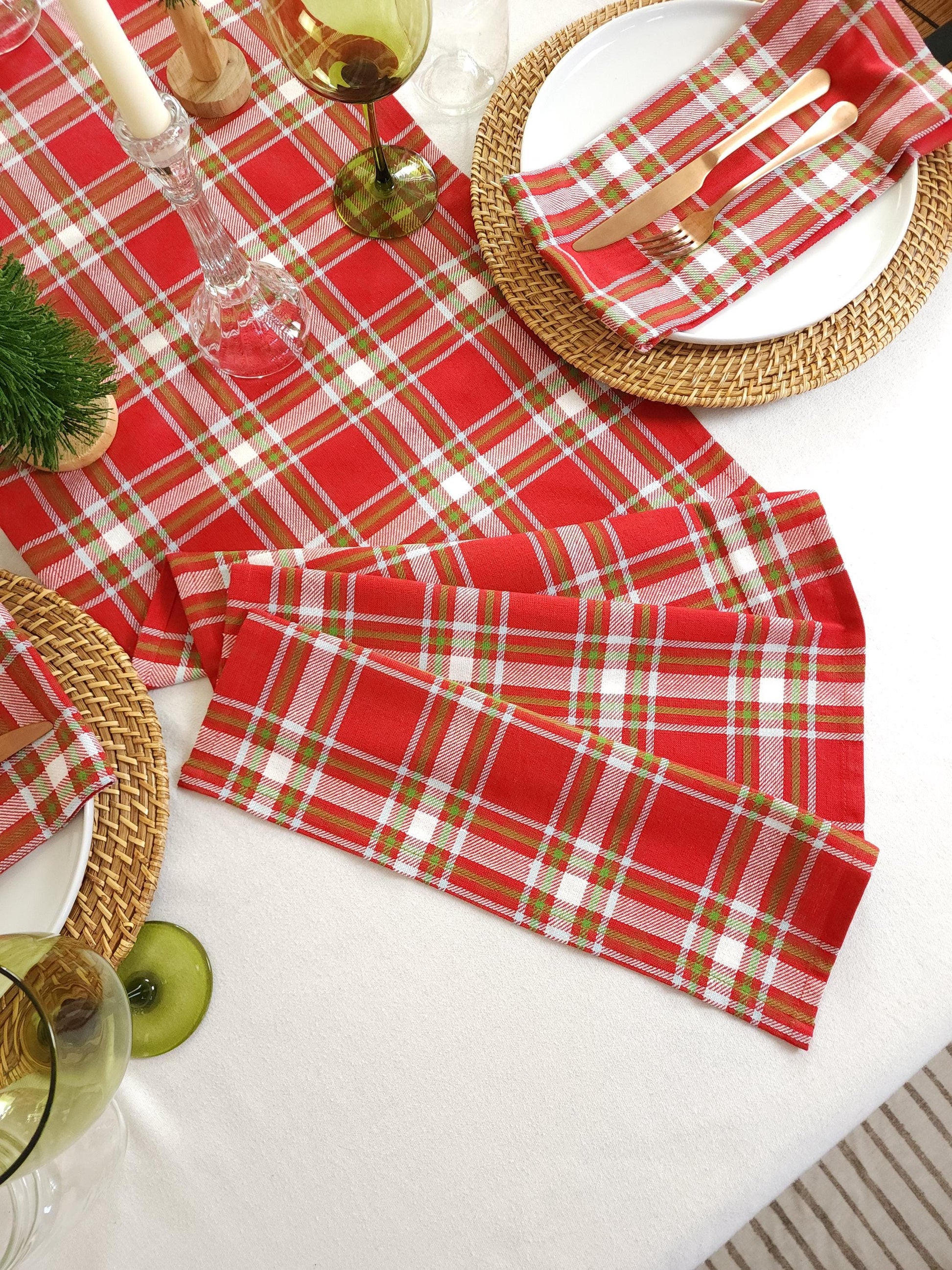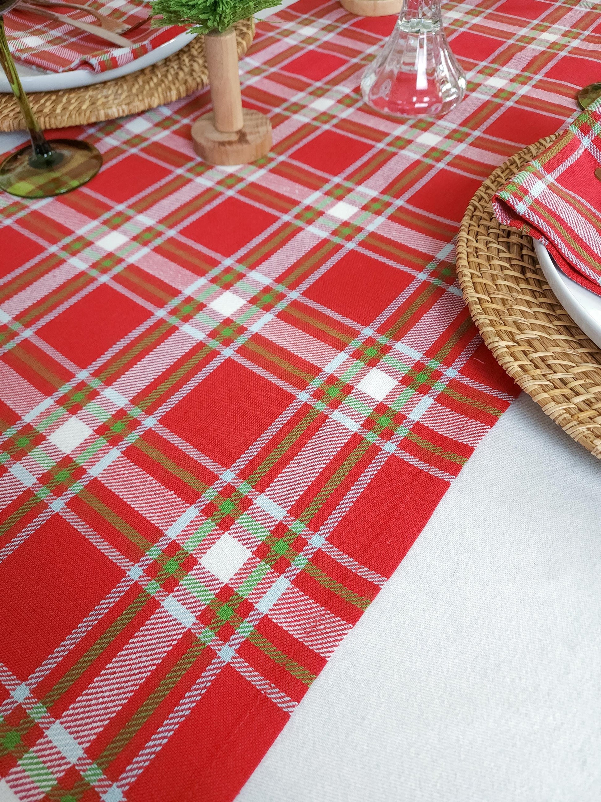 This red plaid table runner is bright and festive for your holiday table. Perfect for Christmas, this table runner is made of softened 100% cotton that's  red, white, and green.