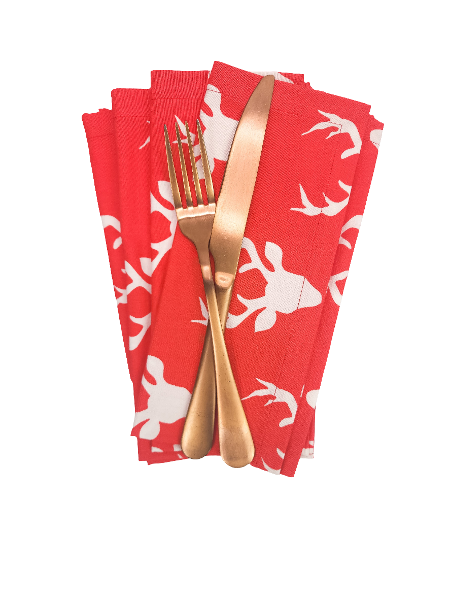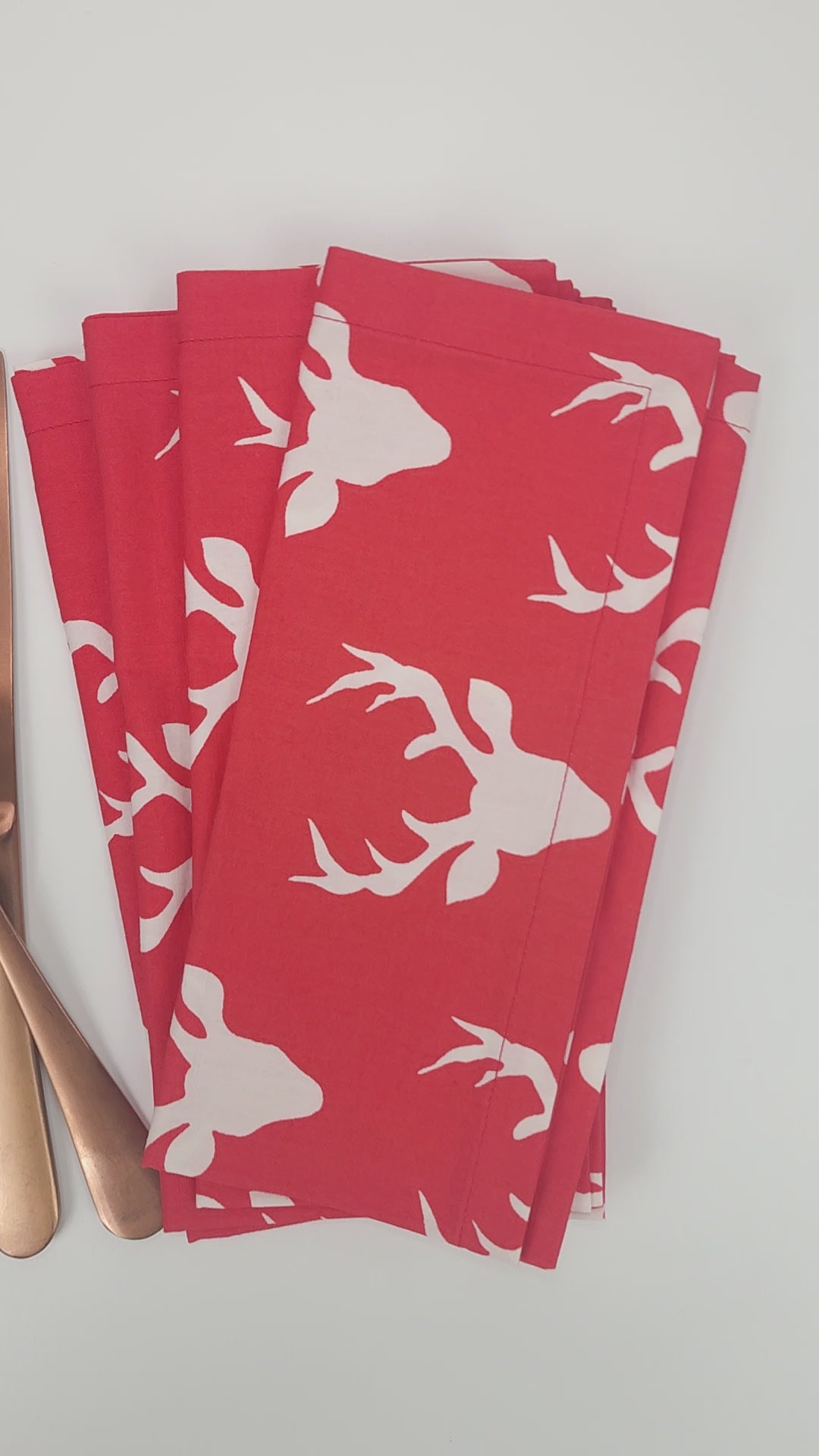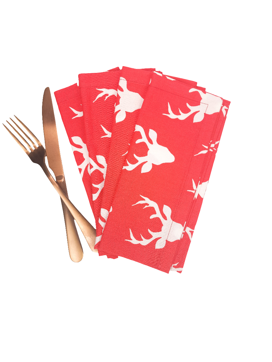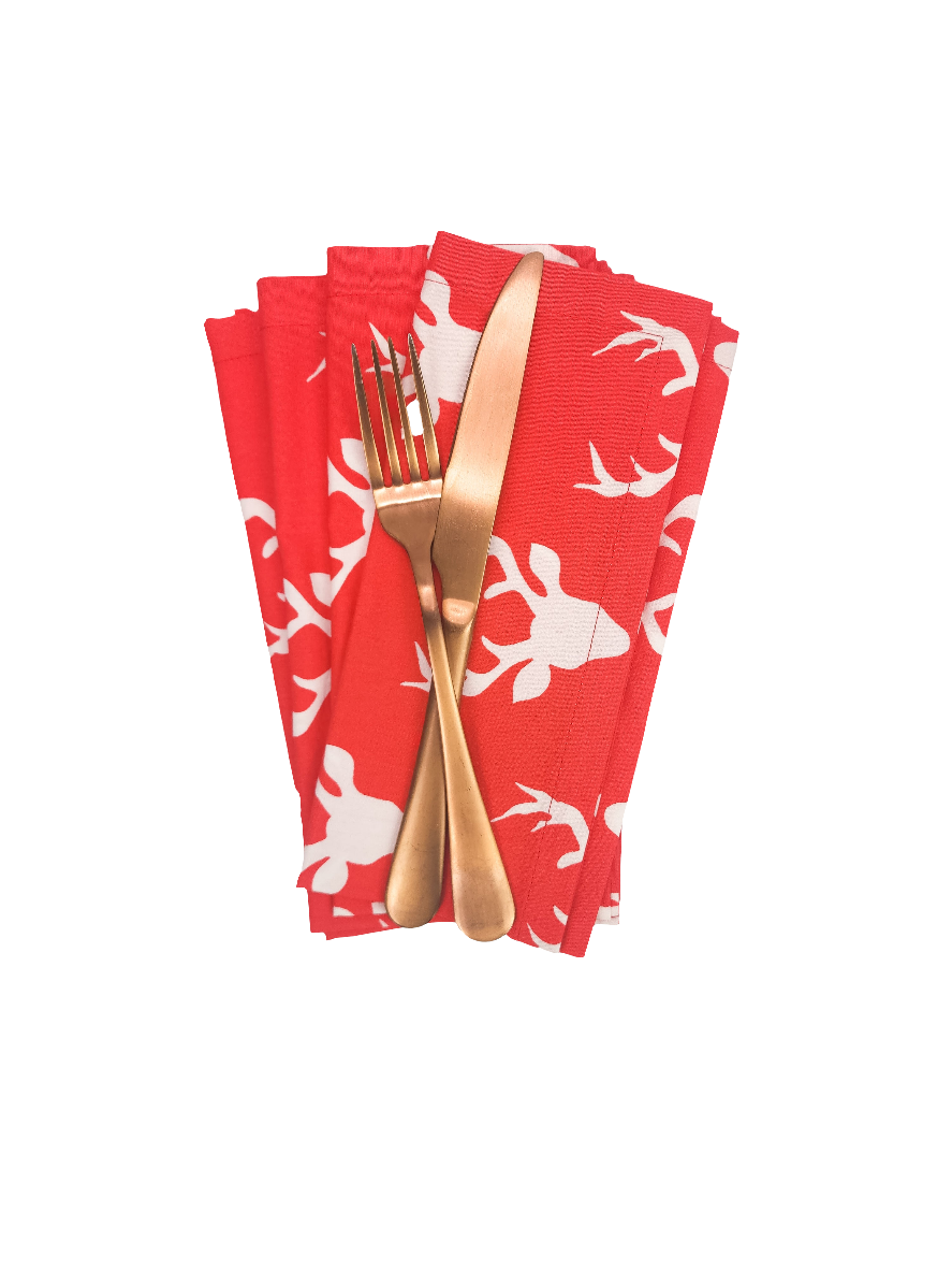 This set of four cloth napkins is made of 100% cotton in a vibrant red with a white stag pattern. Hand-crafted in Denver, CO with beautiful mitered corners for a polished finish. Perfect for everyday use or special occasions.