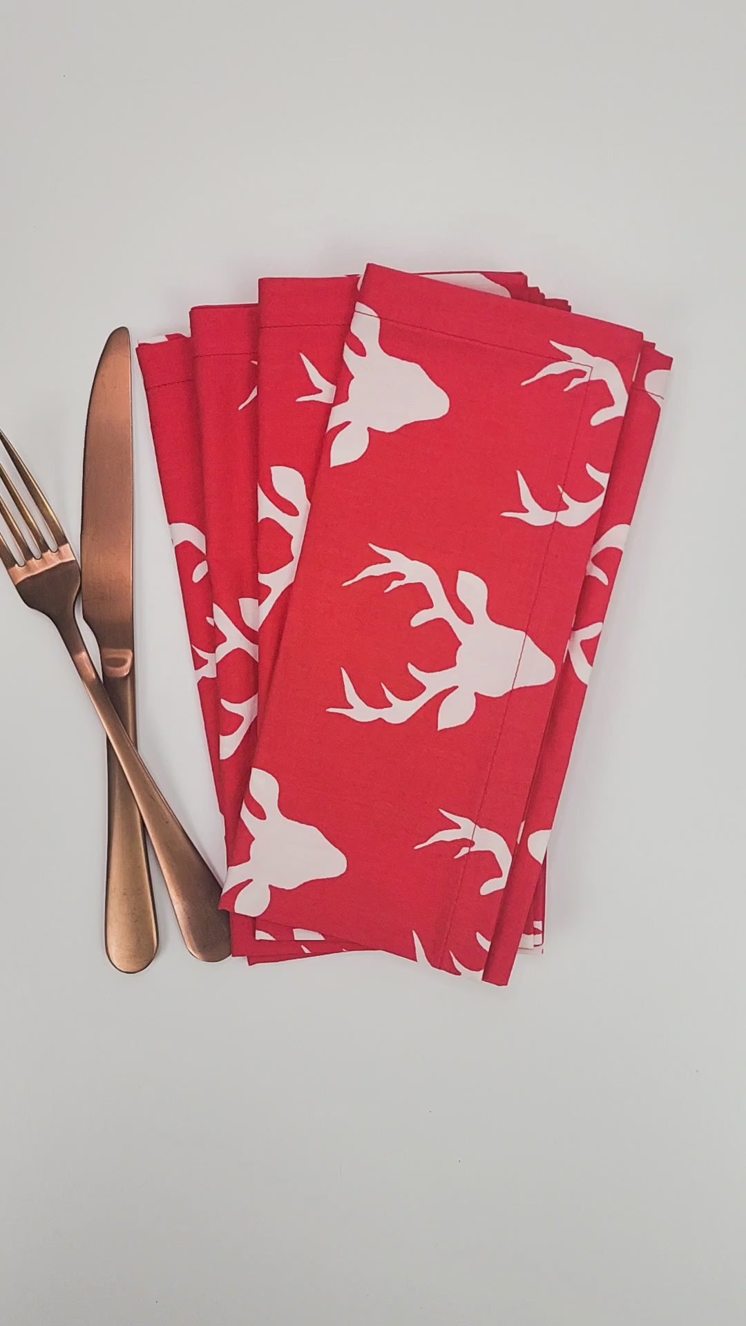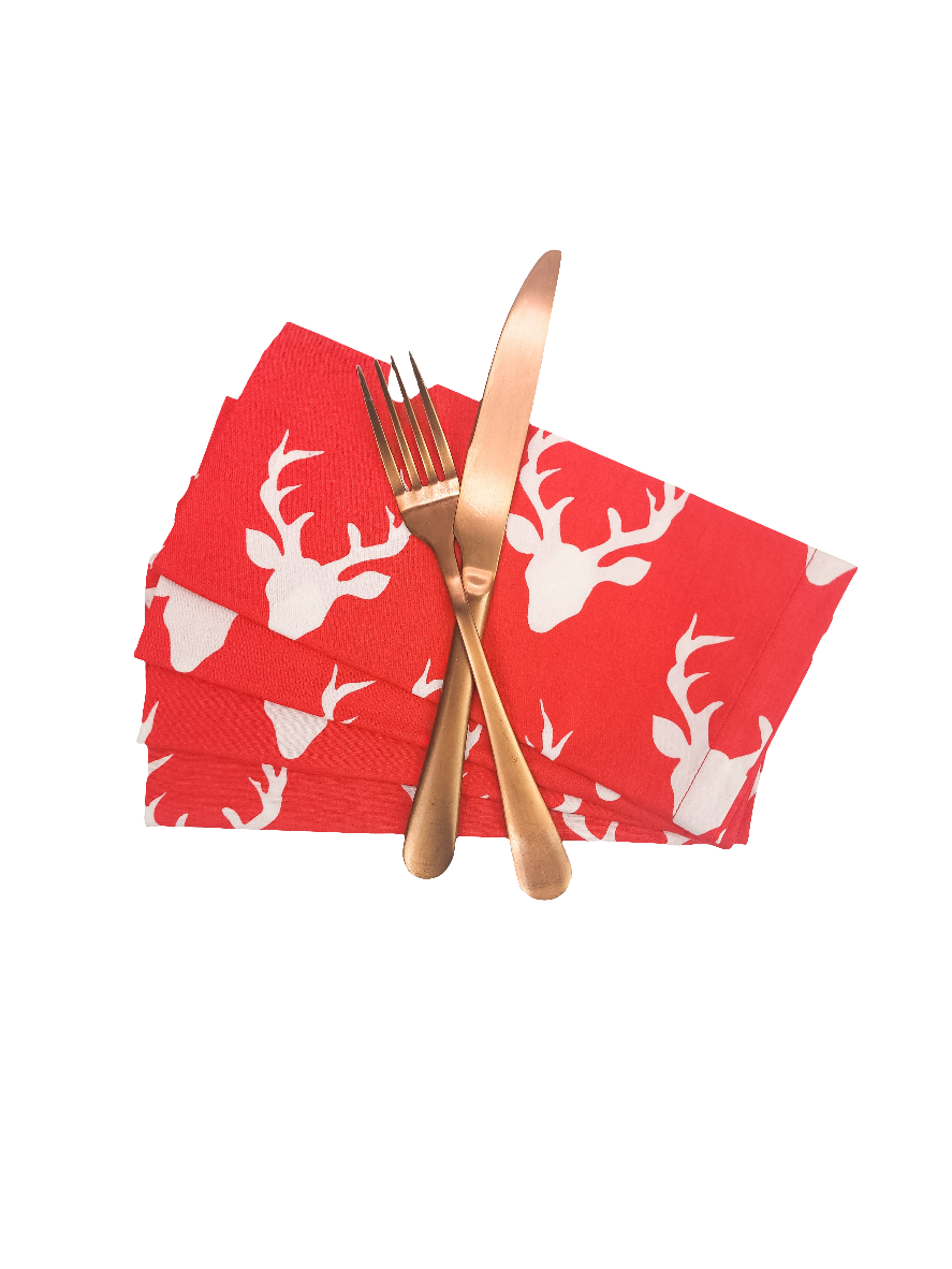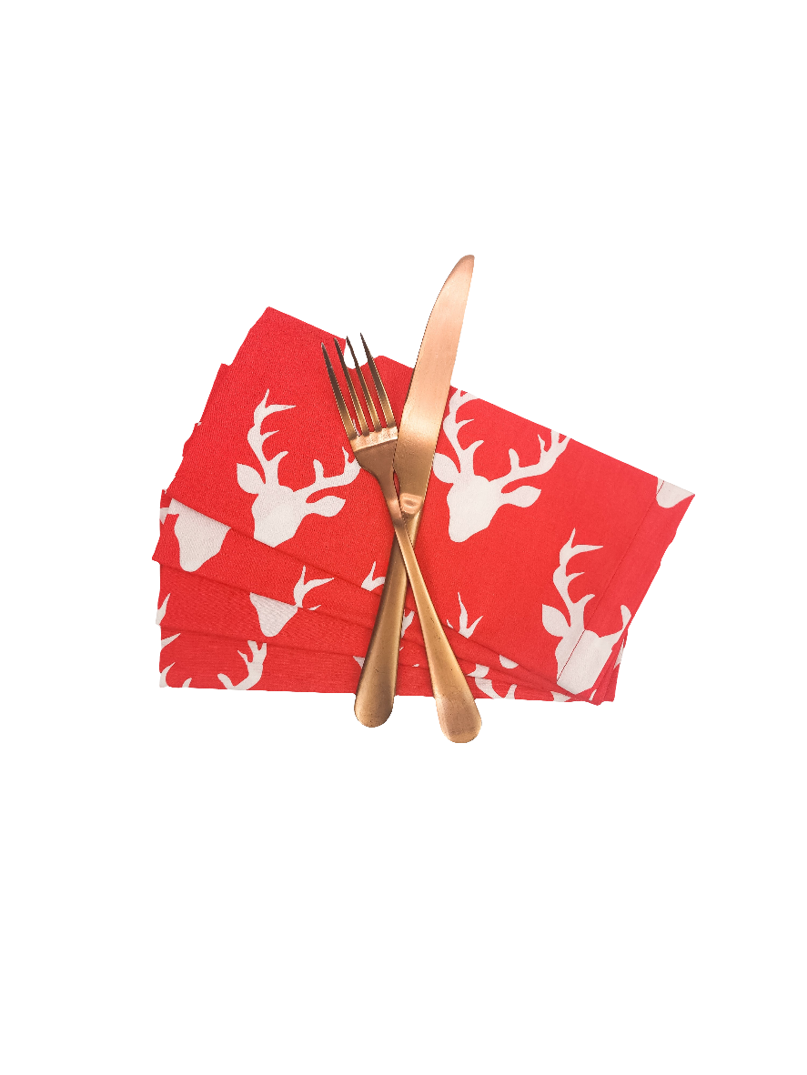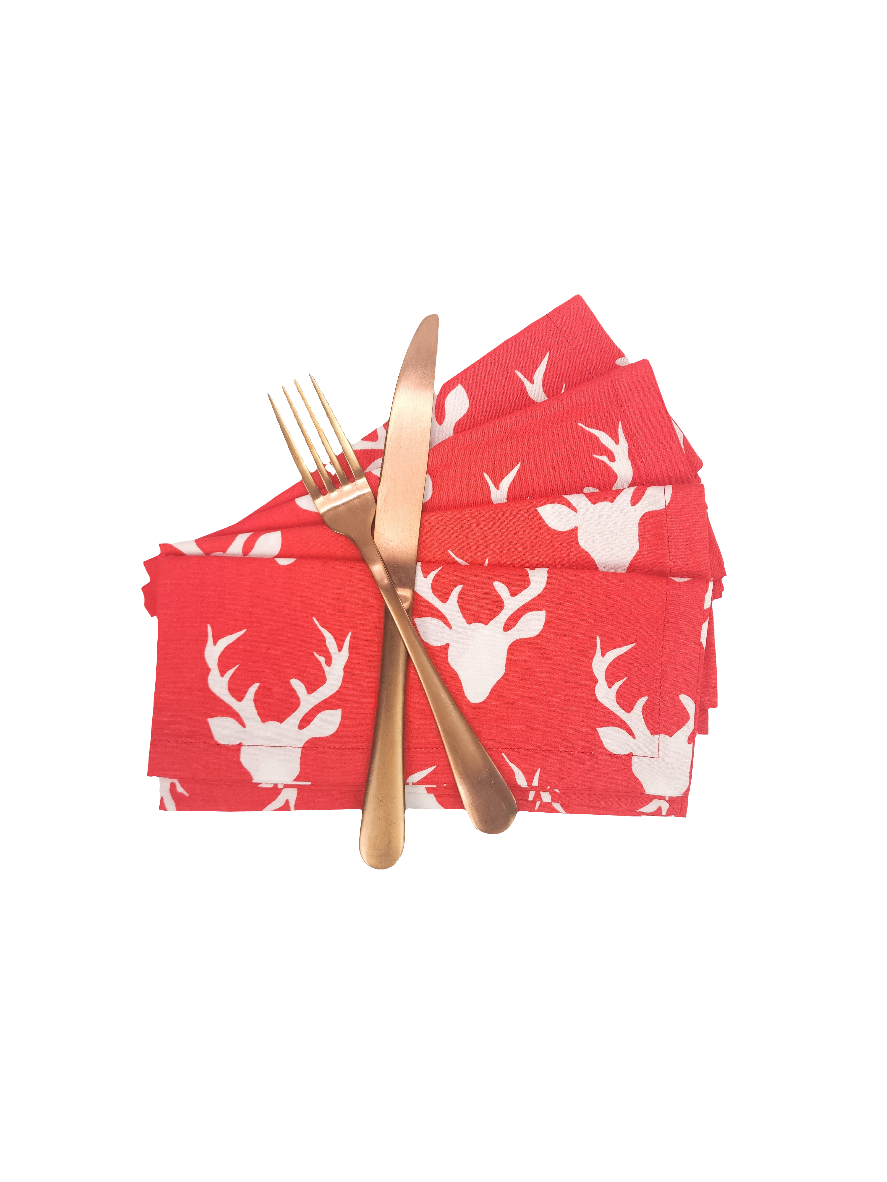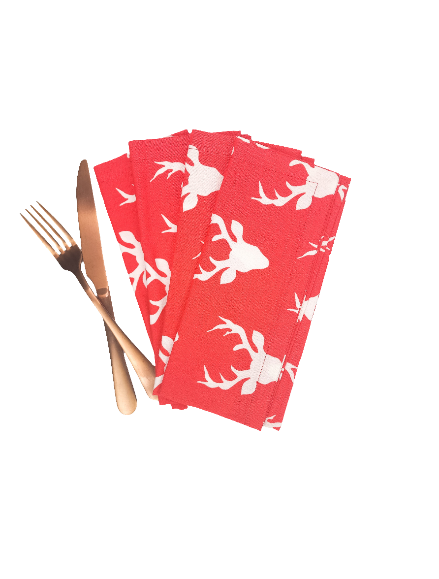 This set of four cloth napkins is made of 100% cotton in a vibrant red with a white stag pattern. Hand-crafted in Denver, CO with beautiful mitered corners for a polished finish. Perfect for everyday use or special occasions.
