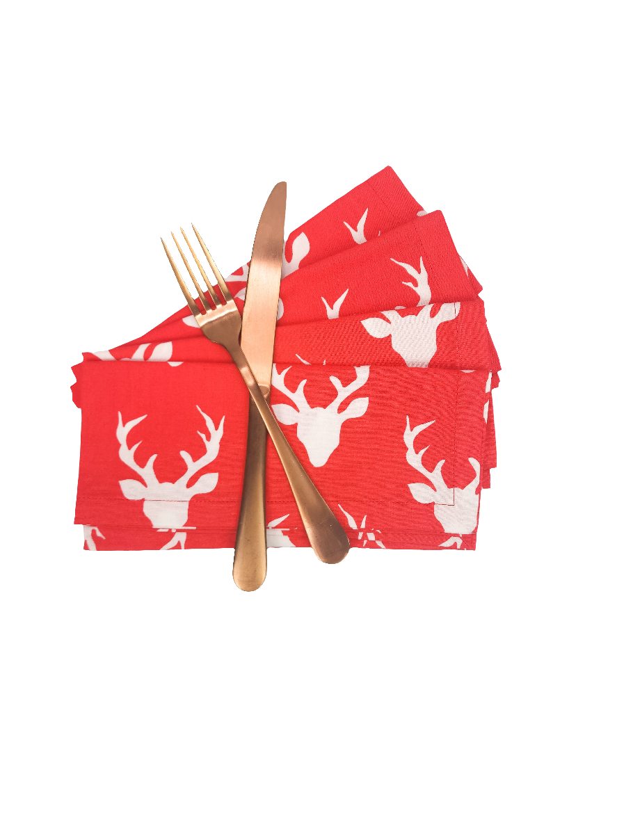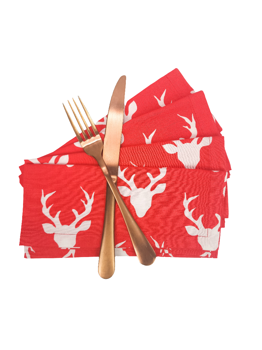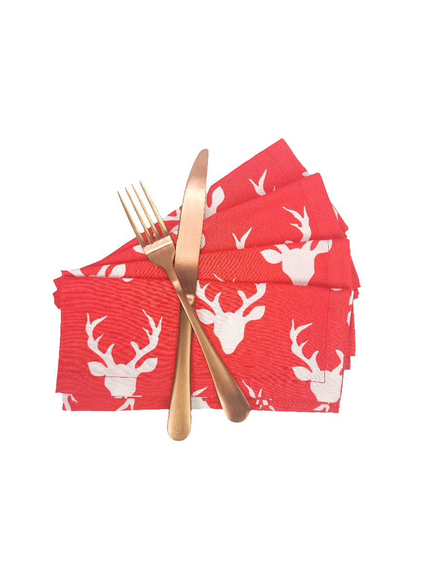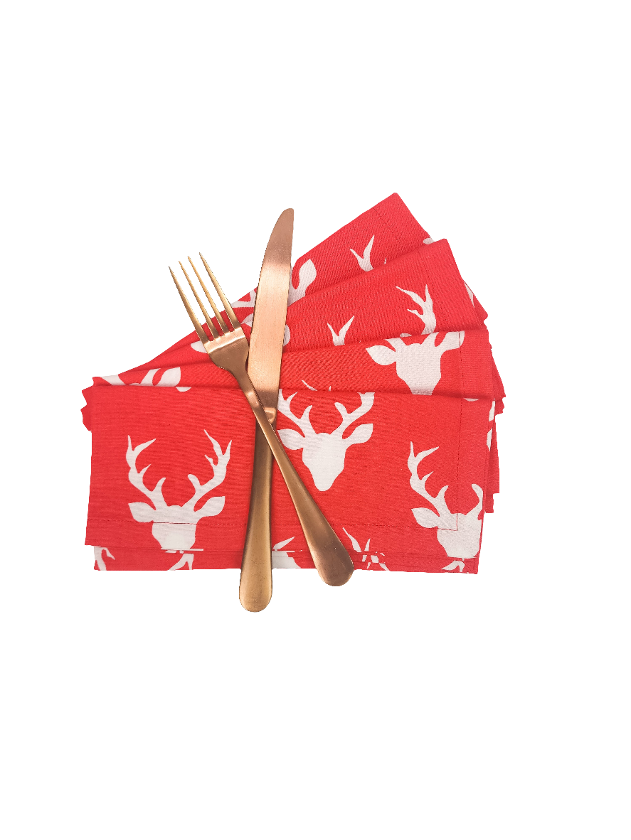 This set of four cloth napkins is made of 100% cotton in a vibrant red with a white stag pattern. Hand-crafted in Denver, CO with beautiful mitered corners for a polished finish. Perfect for everyday use or special occasions.