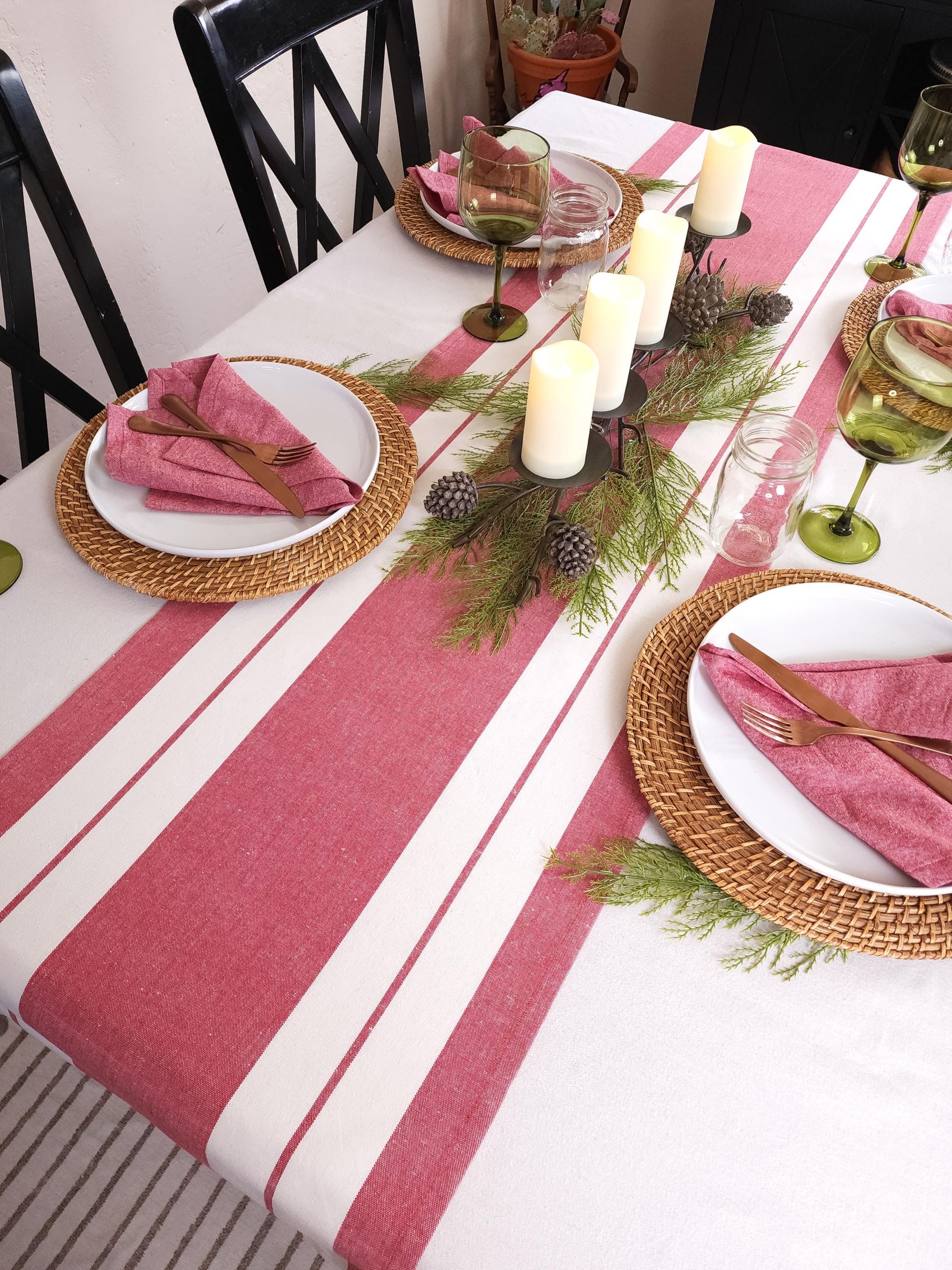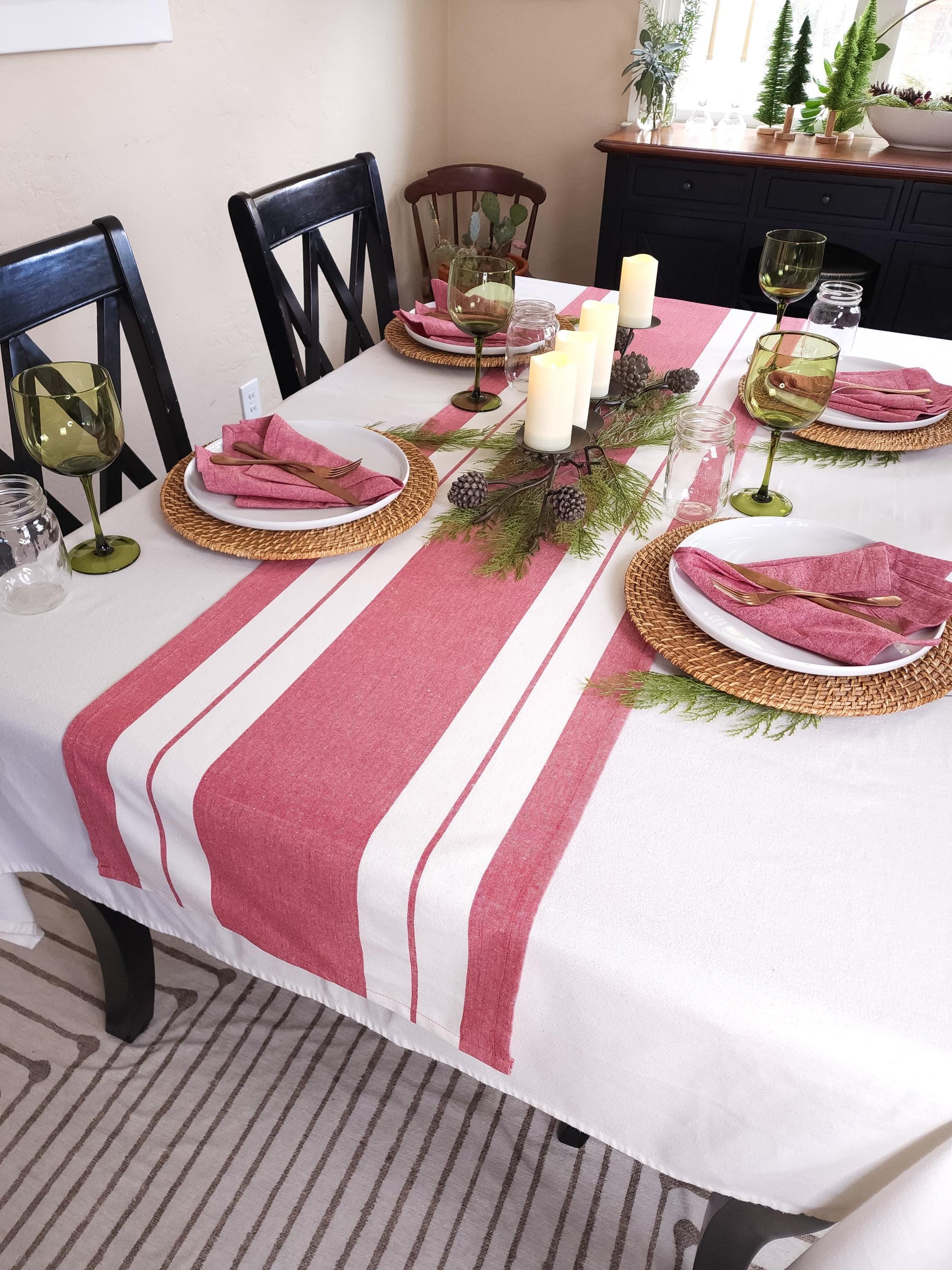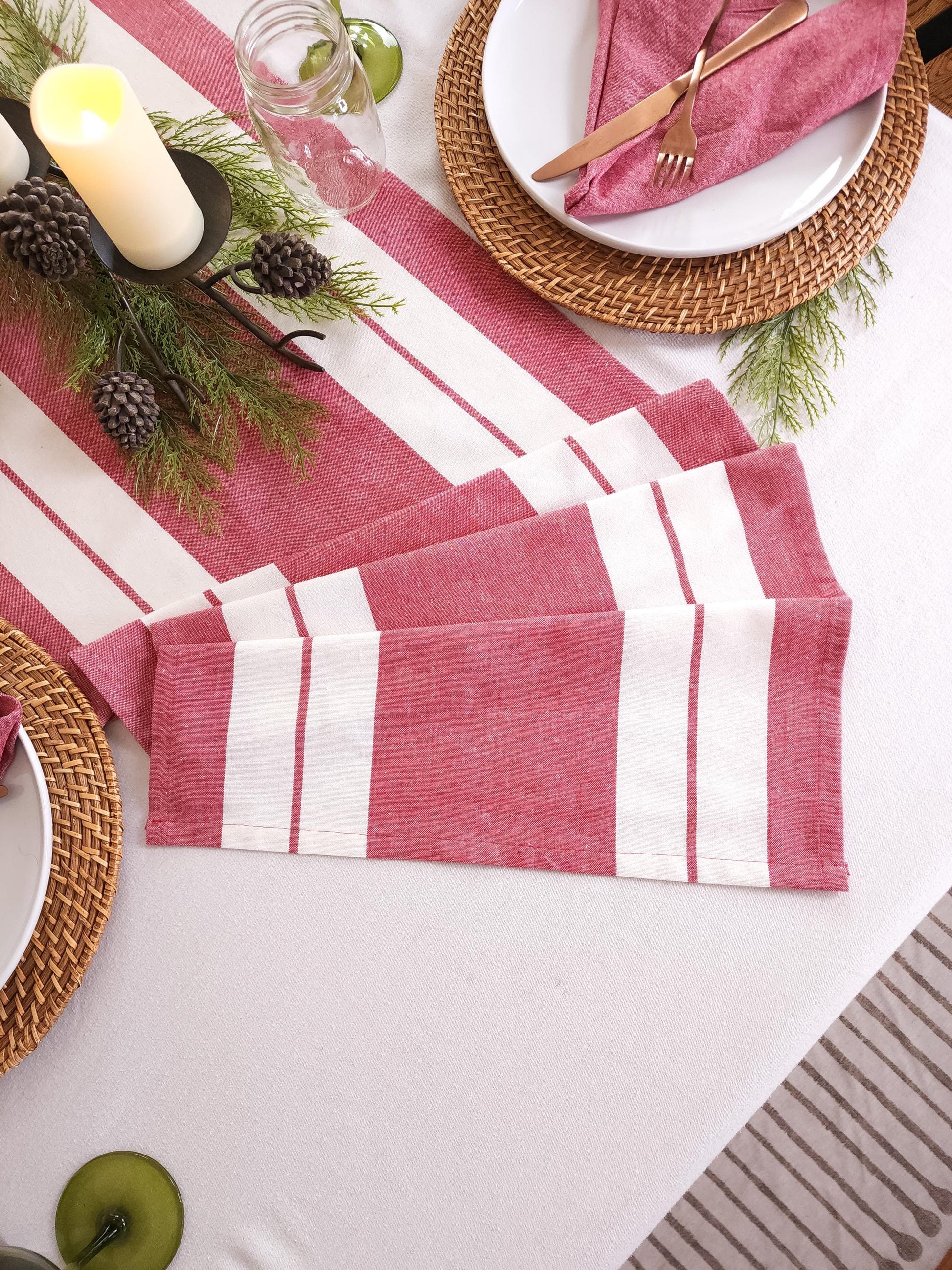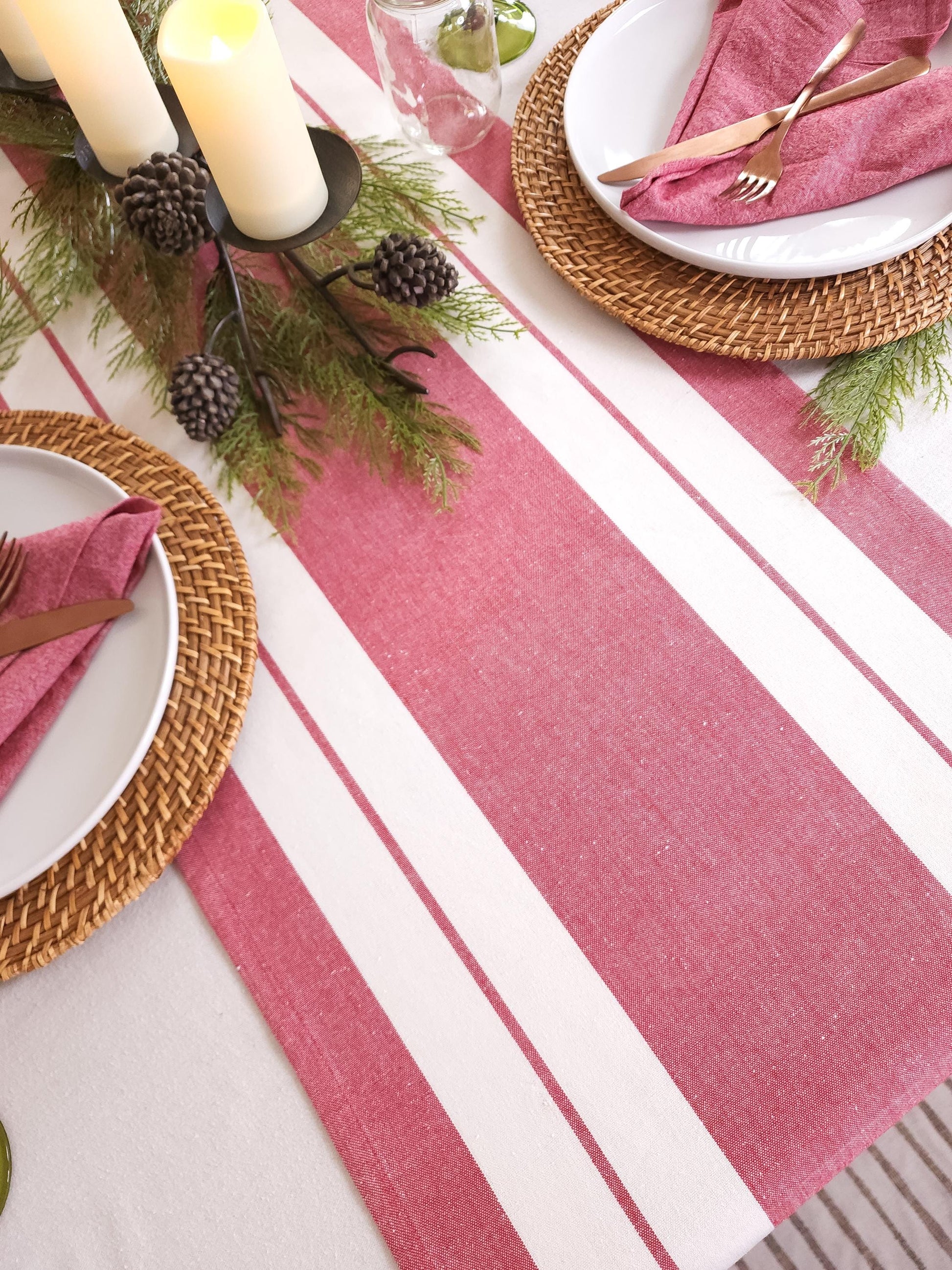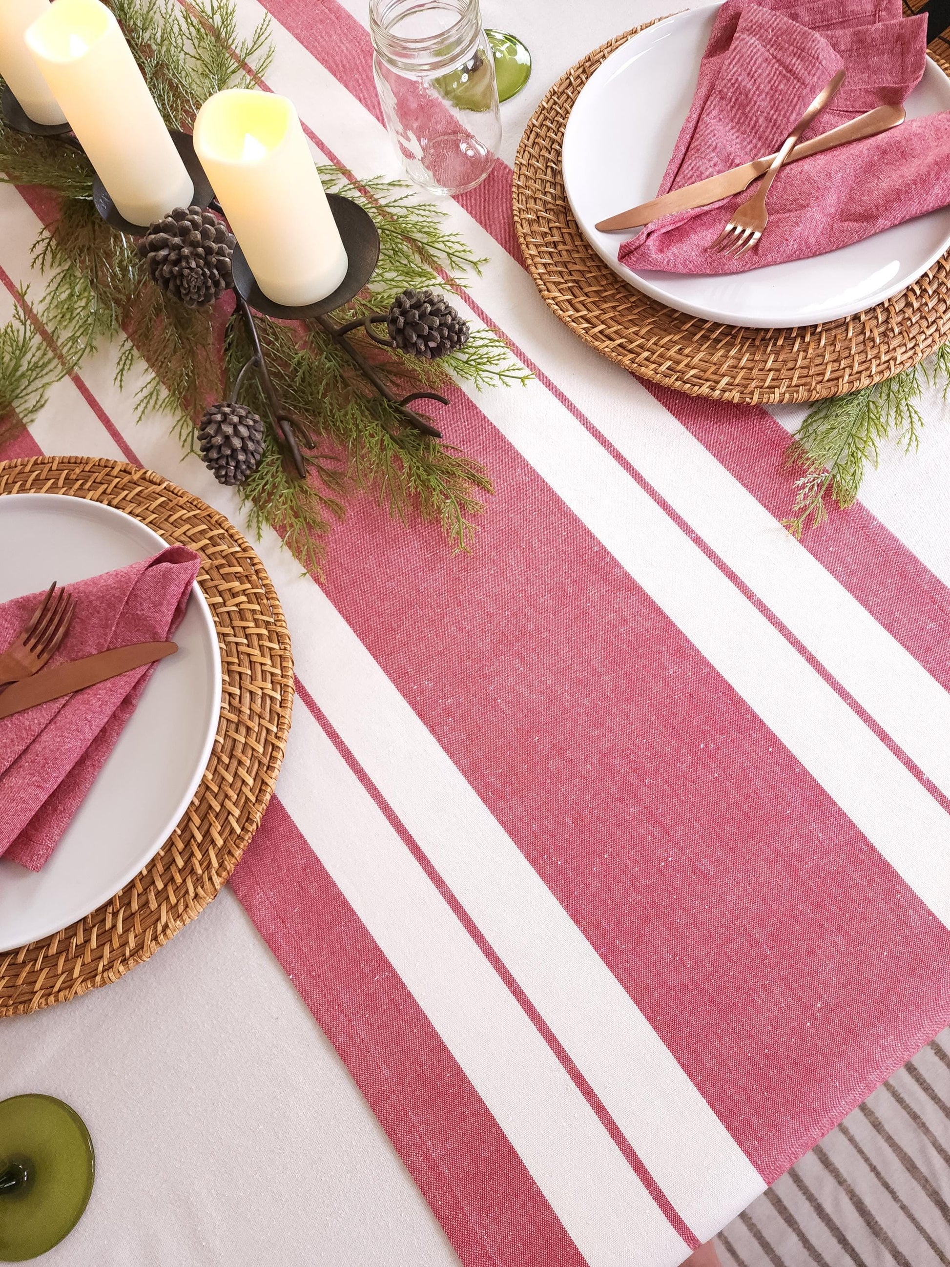 This extra wide table runner is ready for the holidays in rustic red with ivory stripes. This runner is made of lightweight 100% cotton that's machine washable.