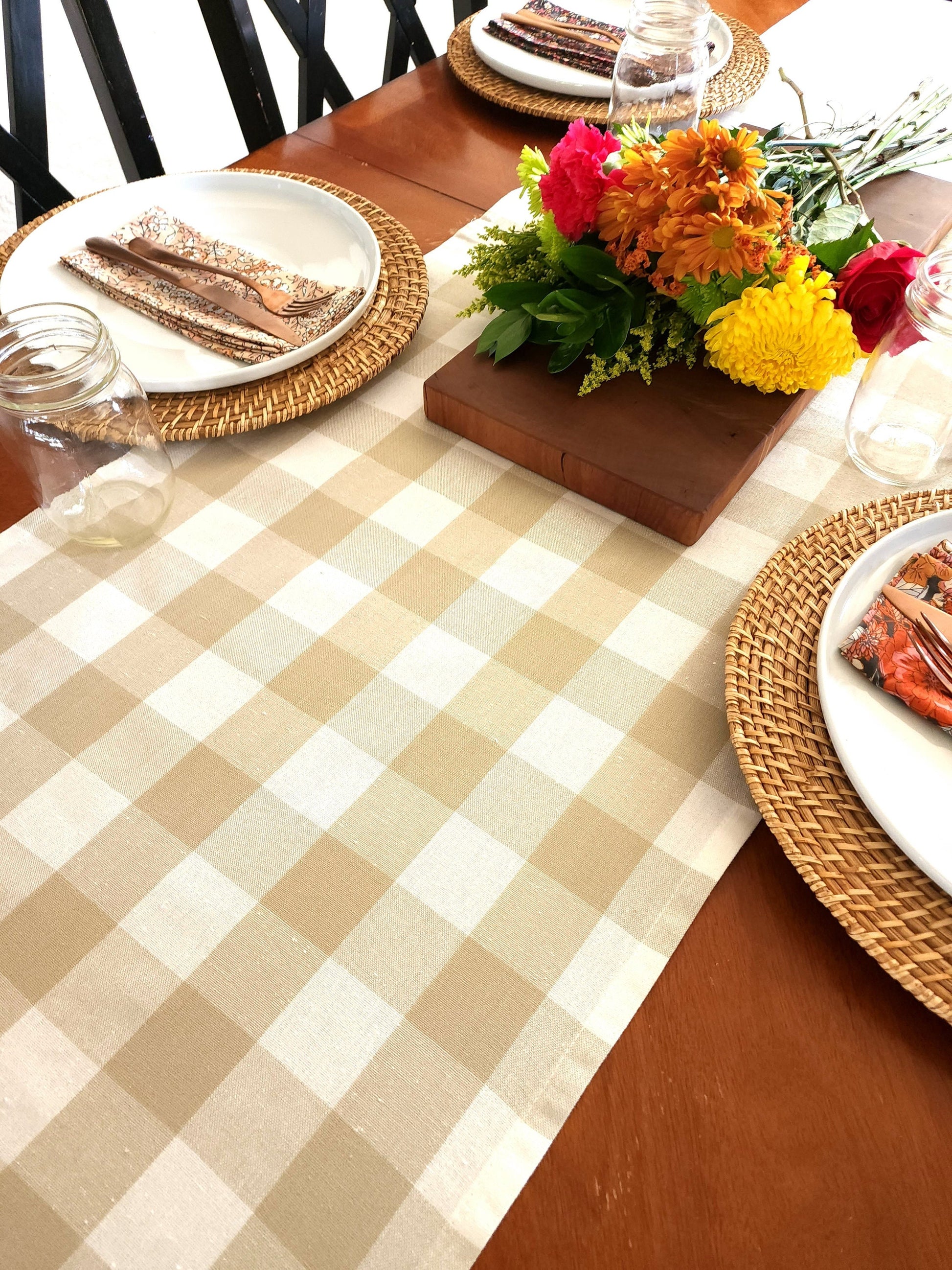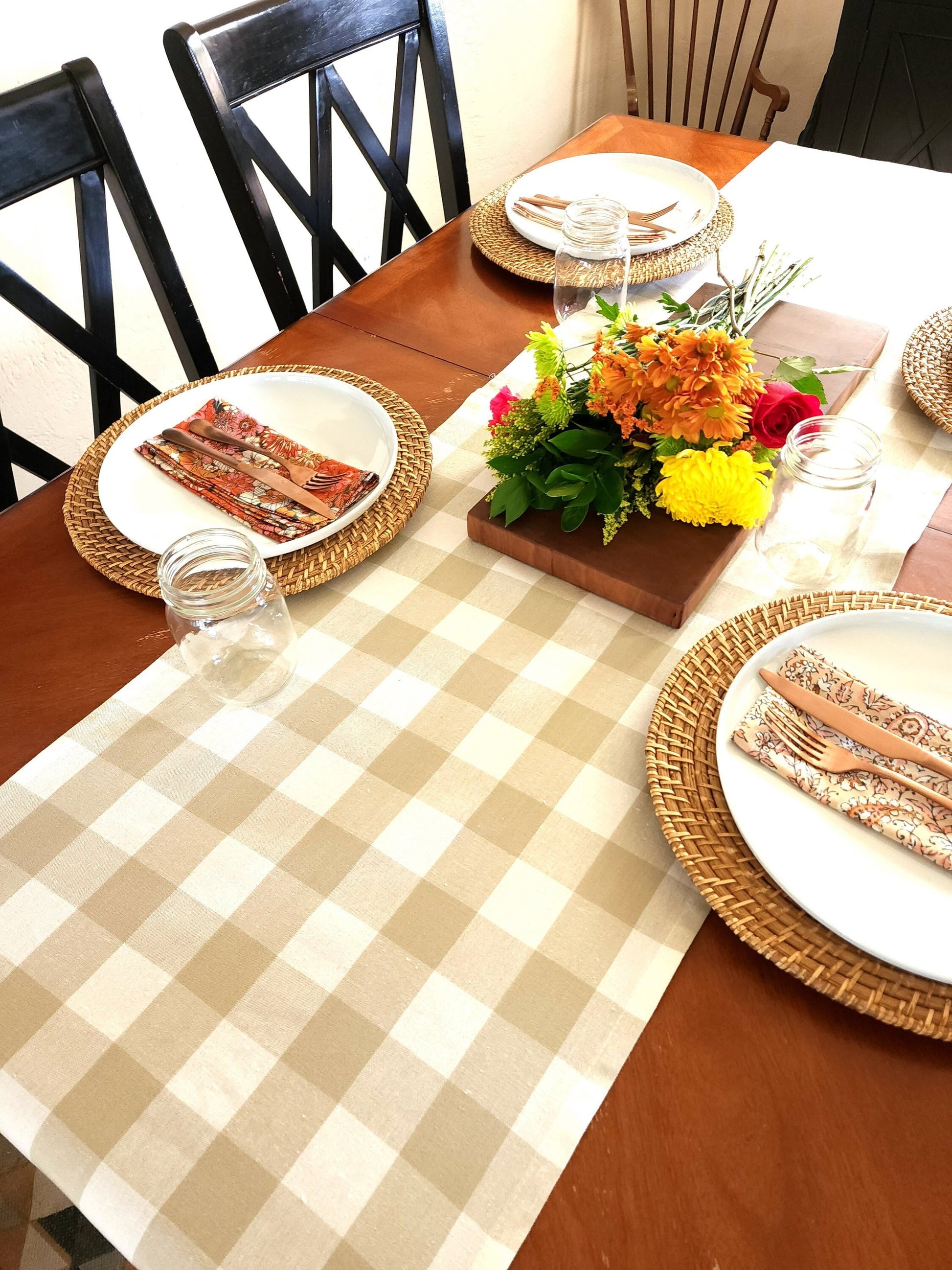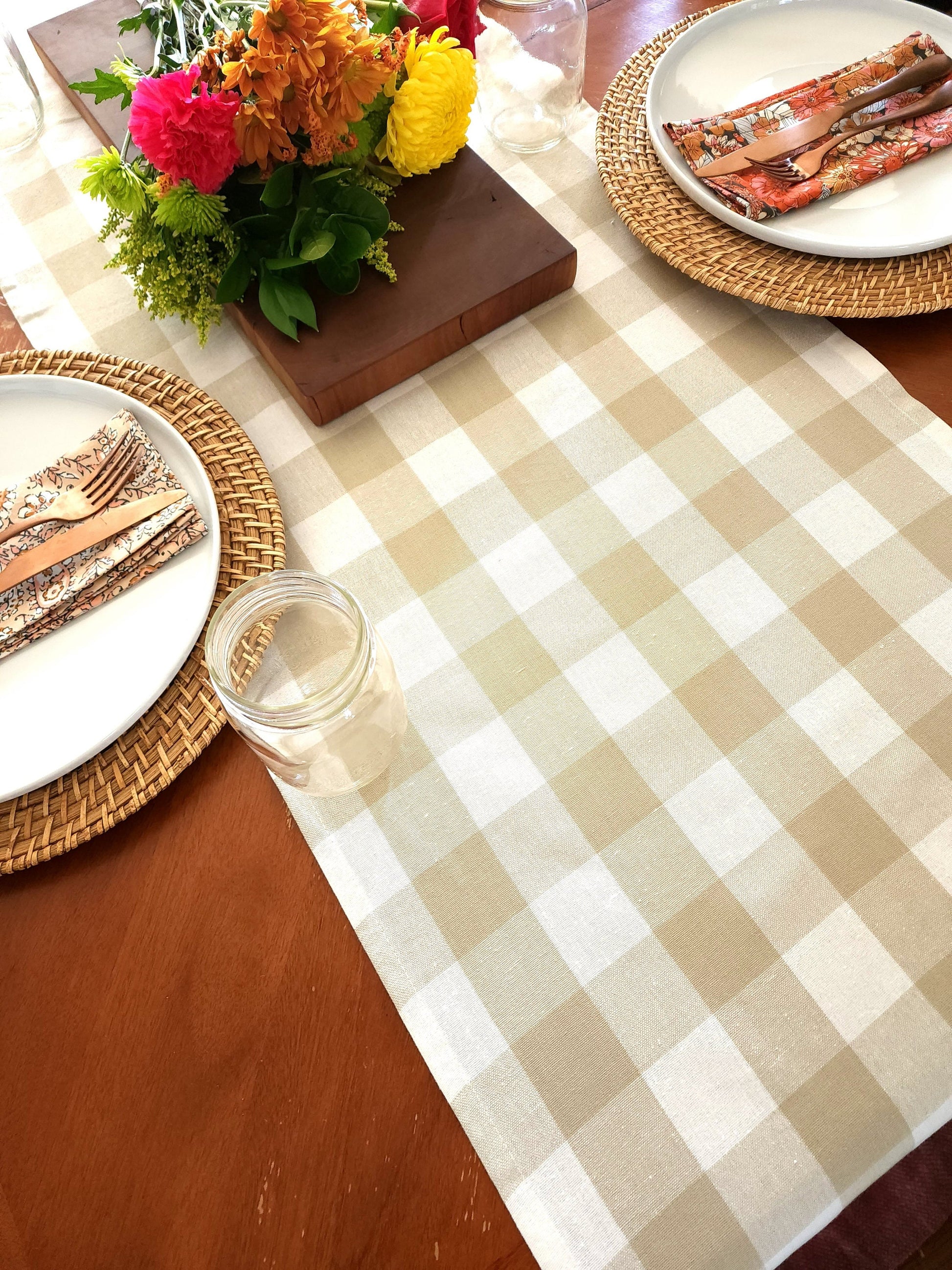 This tan buffalo plaid table runner is pretty and neutral for table settings in all seasons. Your runner is made of machine washable lightweight 100% cotton that's tan and ivory plaid.