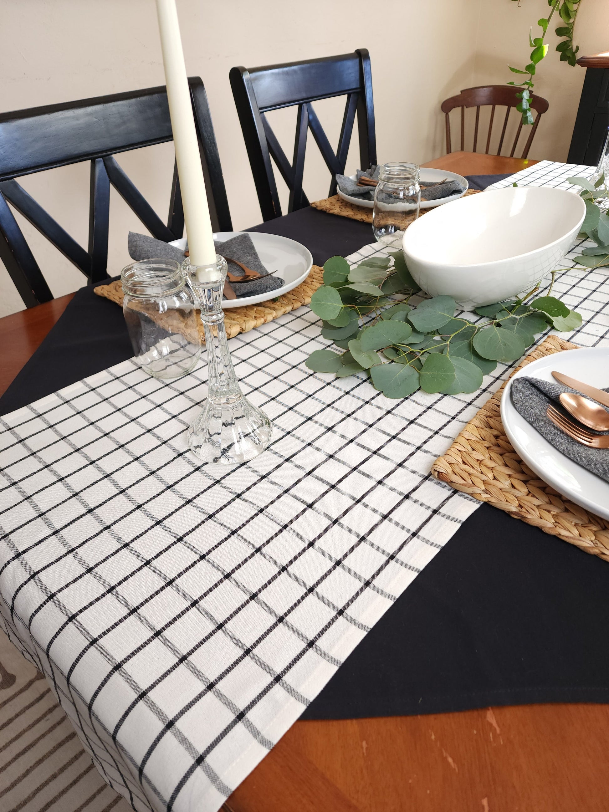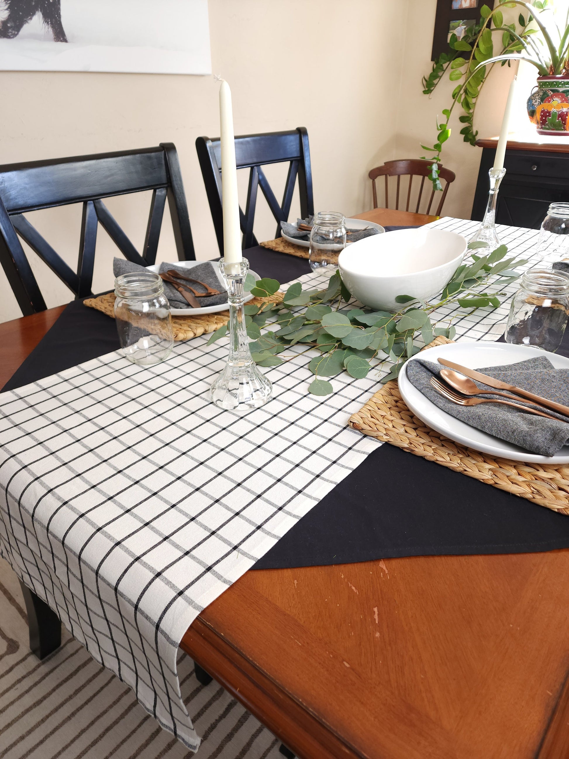 This white and black checkered table runner is pretty for tablescapes year-round. It's perfect for everyday or holidays; you can dress it up or keep it simple. The runner is made of 100% cotton that's off-white with a woven black checkered pattern.