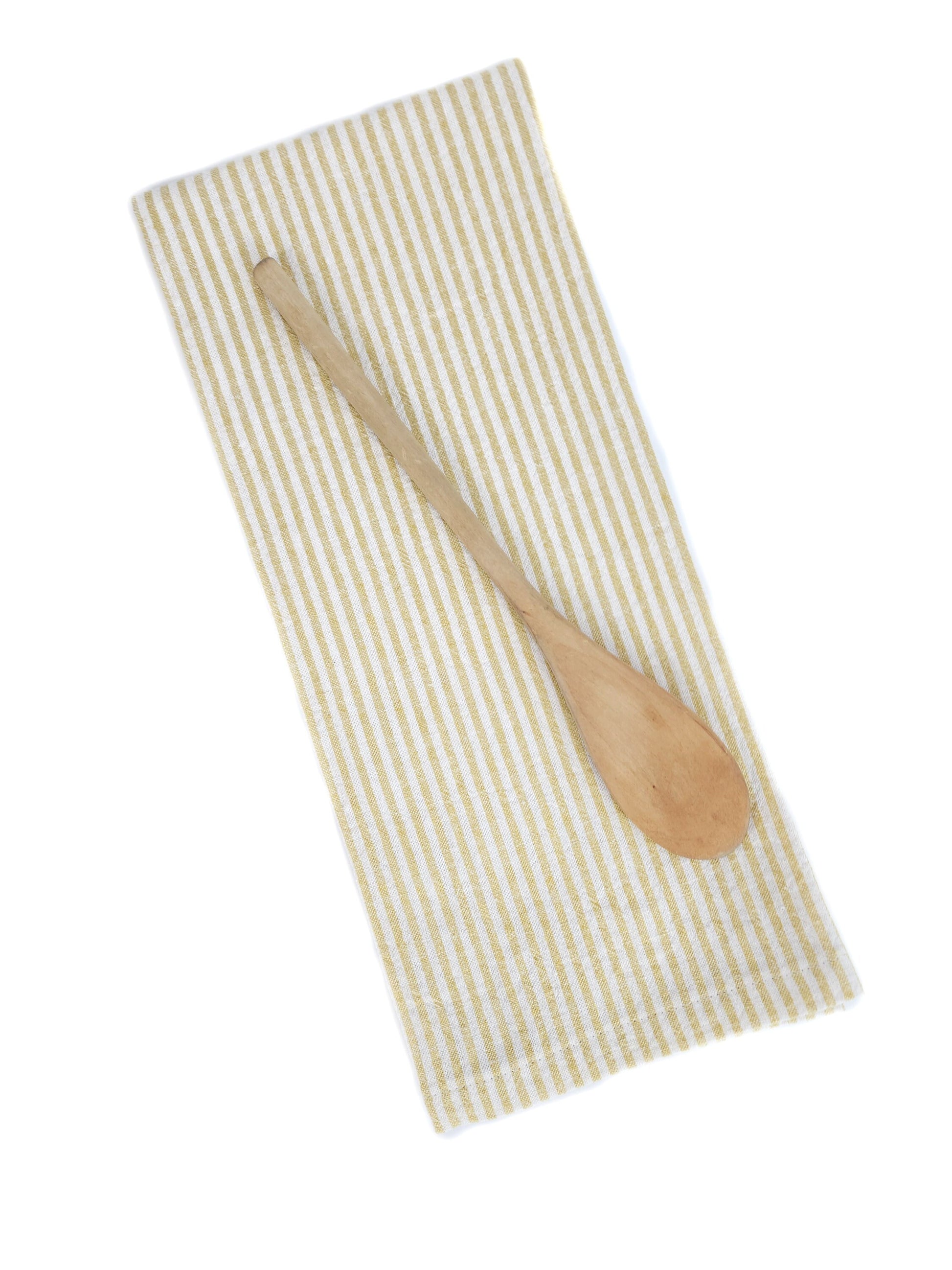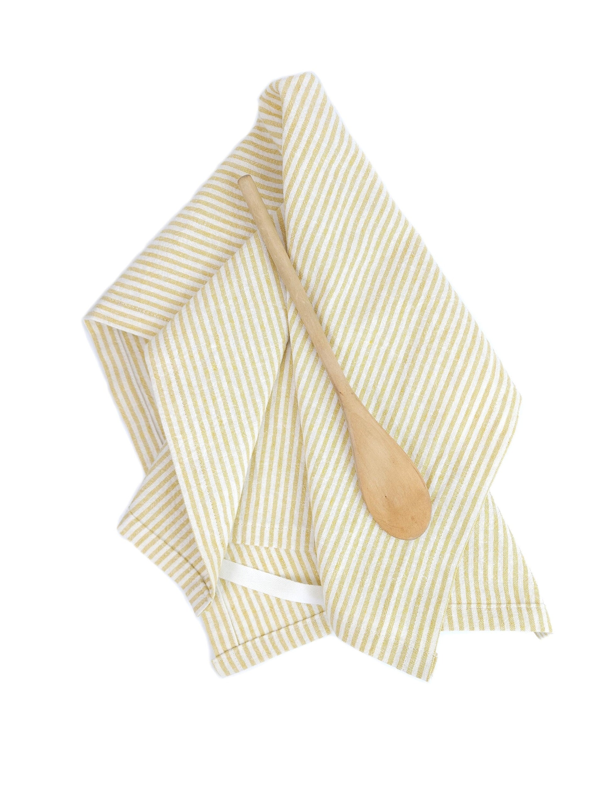 This golden yellow and ivory striped tea towel will be a sunny addition to your kitchen. Made of a pre-washed and dried cotton linen blend, it's lovely and durable. The golden yellow stripes will add joy to your kitchen tasks, be beautiful in a bread basket, or be lovely as a gift for your favorite host.